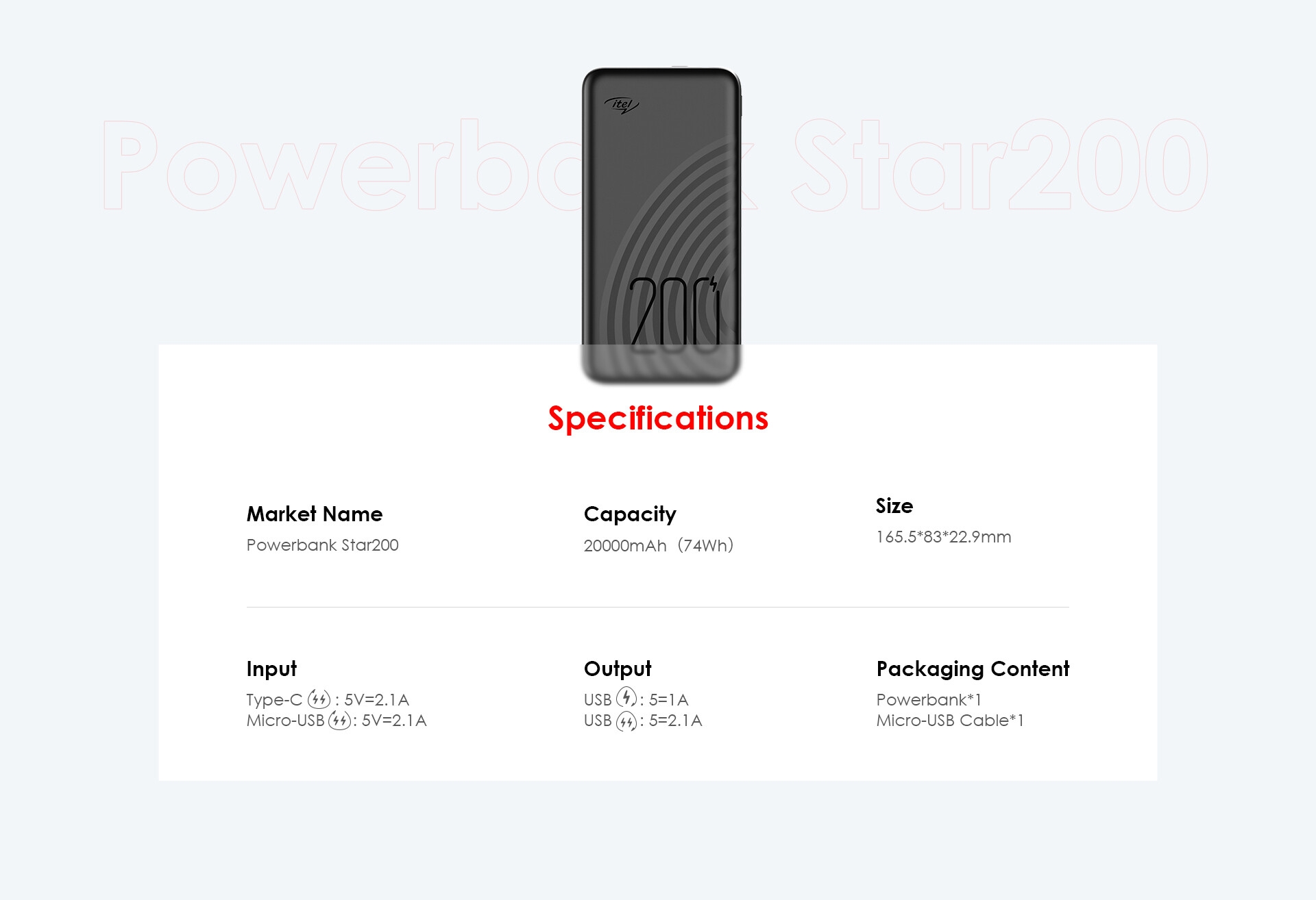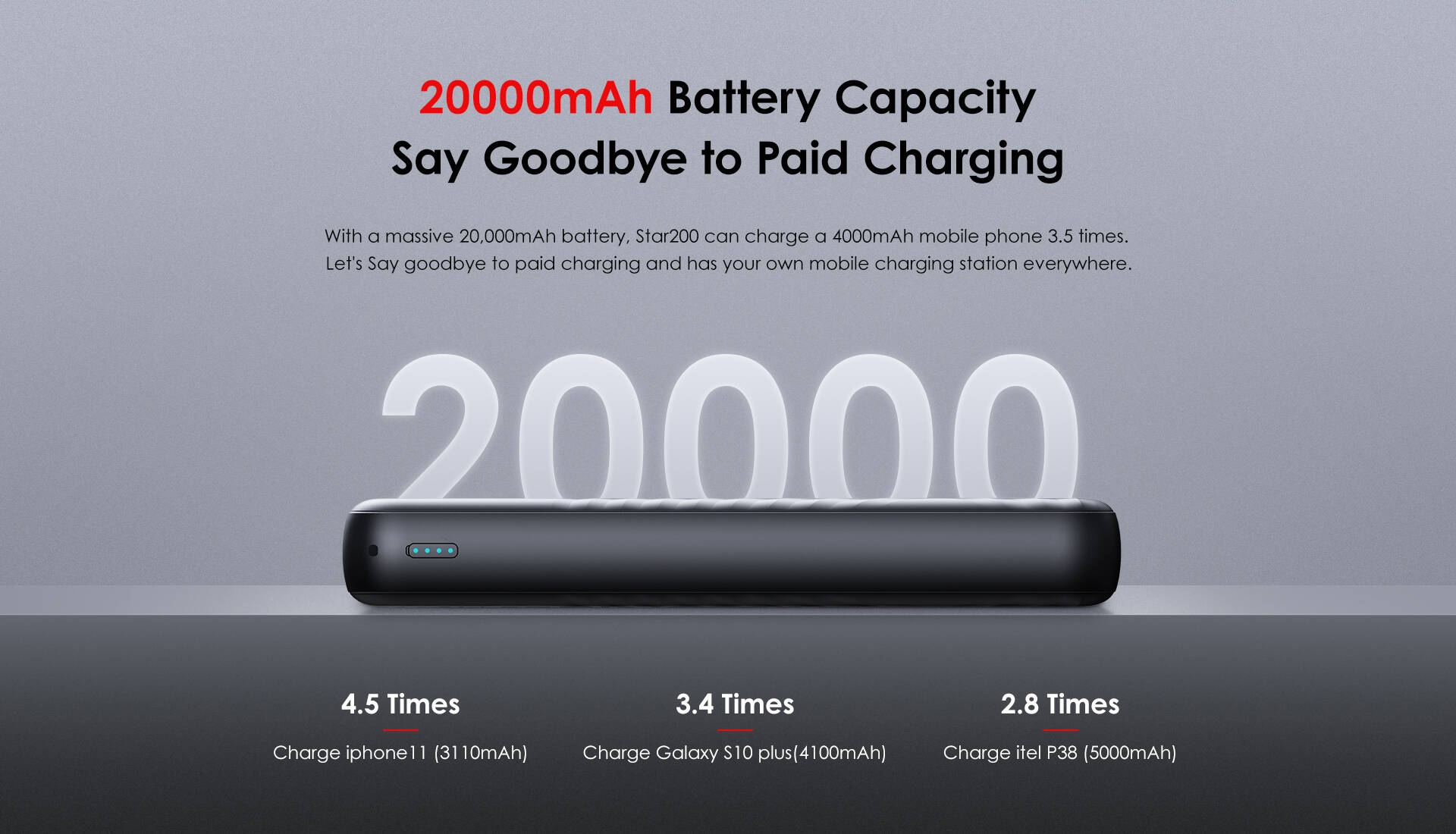 With a massive 20,000mAh battery, Star200 can charge a 4000mAh mobile phone 3.5 times.
