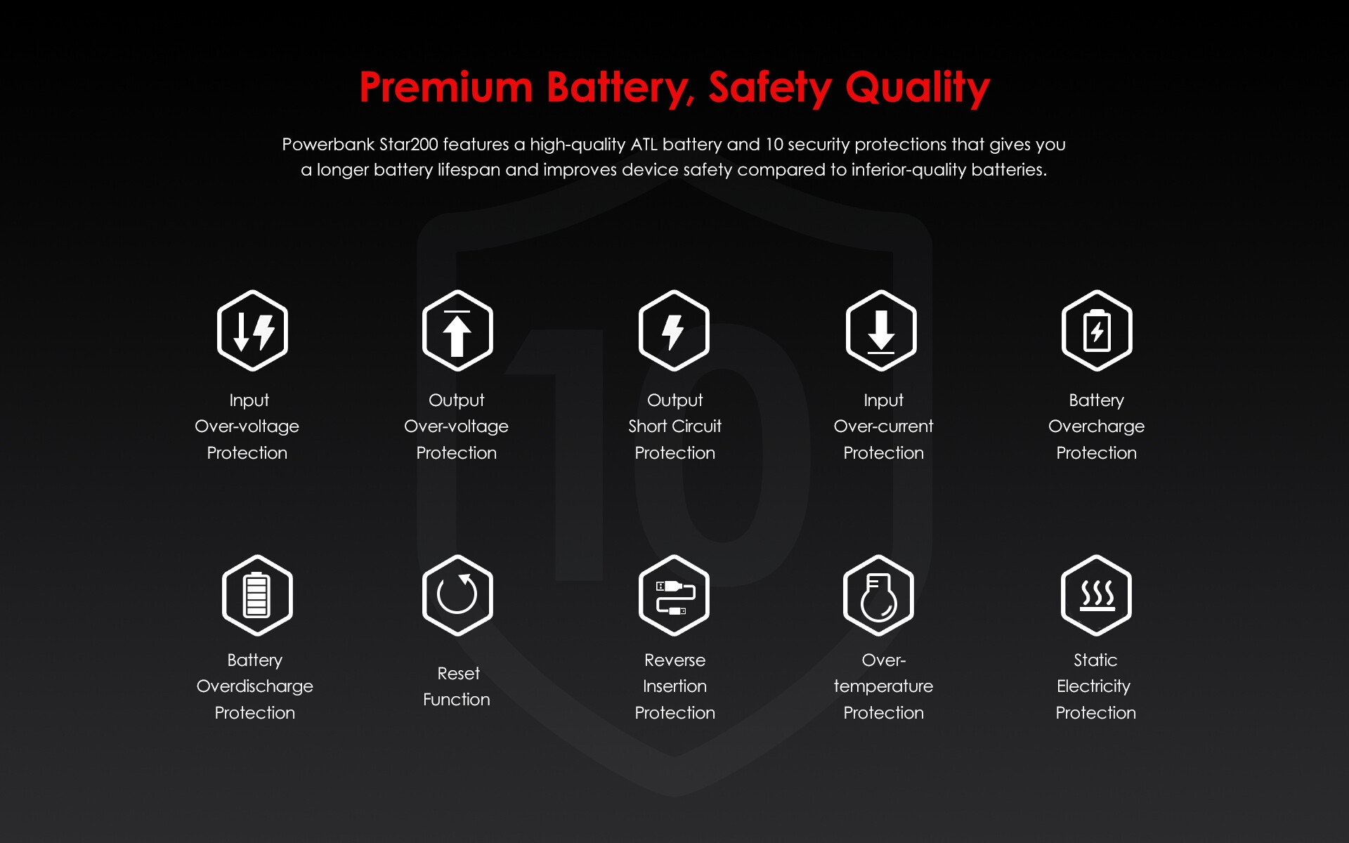 PowerBank Star200 features a high-quality ATL battery and 10 security protections that gives you a longer battery lifespan and improves device safety compared to inferior-quality batteries.