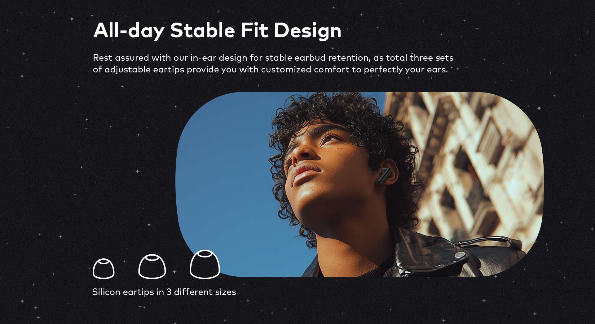 Rest assured with our in-ear design for stable earbud retention, as total three sets of adjustable eartips provide you with customized comfort to perfectly your ears.