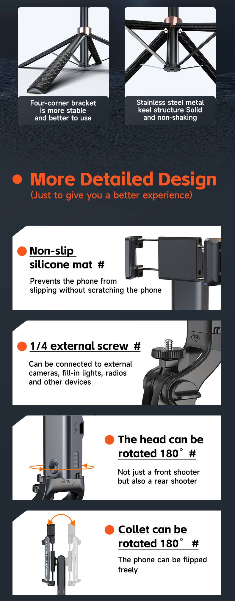 - The gimbal head can be rotated 180°, not just a front shooter but also a rear shooter. The phone clamp can be rotated180°, the phone can be flipped freely