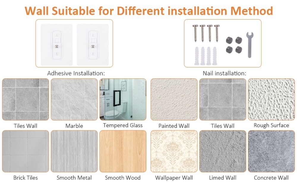 Features two mounting options: strong self-adhesive pads for drill-free setup, or stainless steel screws for permanent placement. Includes a complete set of hooks, adhesives, nails, and caps for immediate installation.