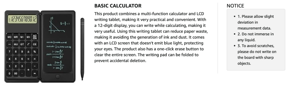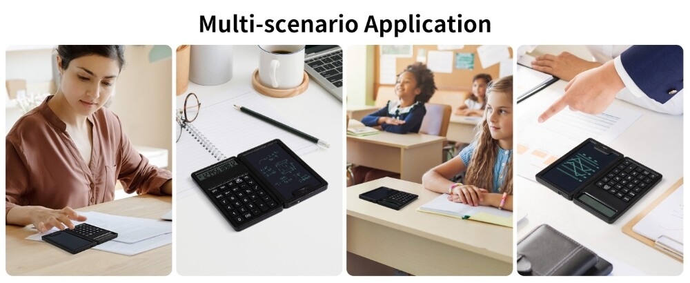 Integrated 12-digit calculator with reusable writing tablet enables simultaneous calculation and note-taking while protecting privacy with one-touch erasure.