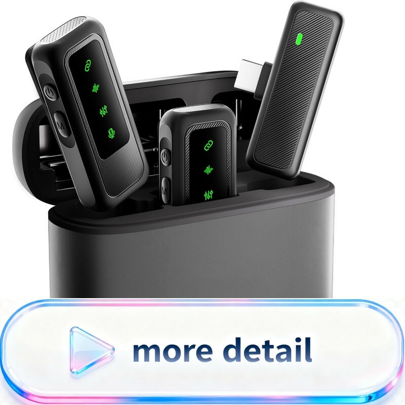 Ultra-compact mic delivers 24-hour runtime - charging case shows precise power levels for non-stop recording during extended events.