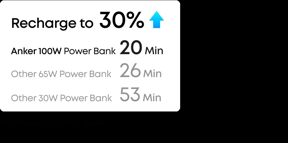 100W from Any USB-C Make the most of every USB-C port, each providing 100W to swiftly recharge the power bank to 30% capacity in just 20 minutes.