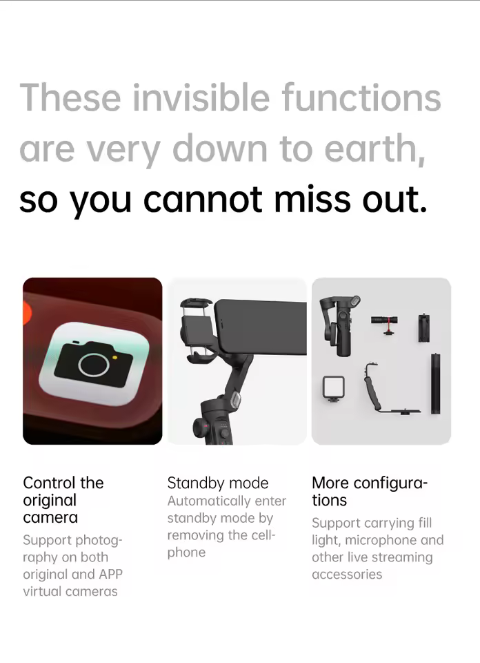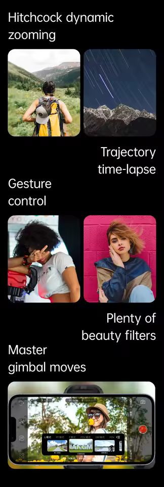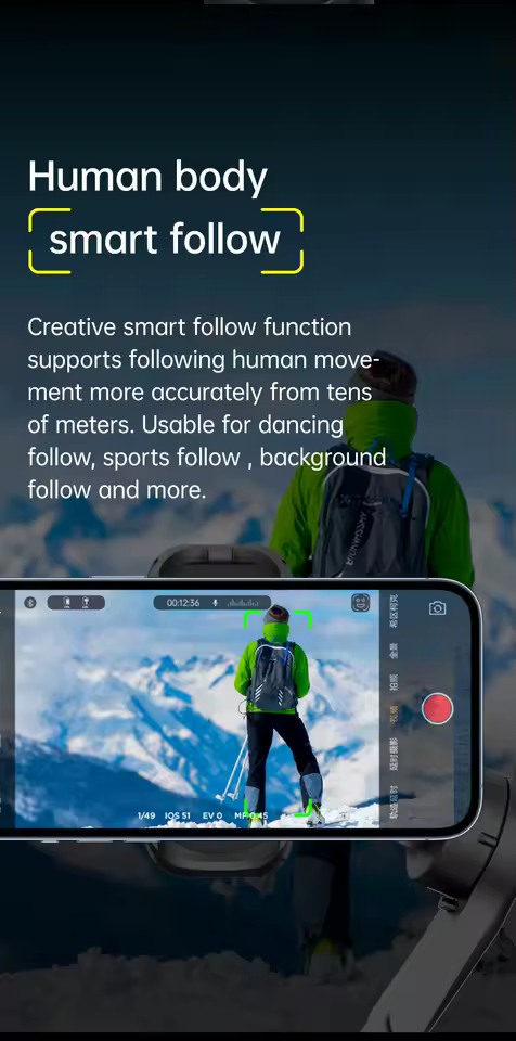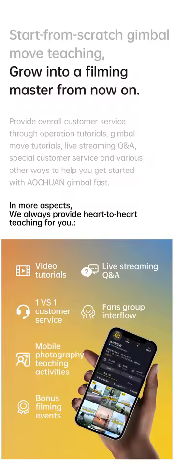 AI Face Track 4.0. Intelligent gesture control. All of this is included in our Intuitive AOCHUAN app. Easily shoot panorama, wide-angle, movie and cinema modes, live streaming, time-lapse, mobile, and more, and optimize your smartphone's native camera settings. Tutorial videos are available on our integrated app and YouTube channel.