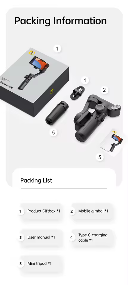 Equipped with SMART 7.0 anti-shake algorithm and 3 enhanced powerful brushless motors, you can use this gimbal set to generate smooth and stable video output for professional videos. Start becoming a professional videographer now. Packaging and Support. Includes AOCHUAN SMART XE gimbal stabilizer, extension pole, tripod, USB-C charging cable, and user manual. Each AOCHUAN gimbal comes with 12 months of customer support.