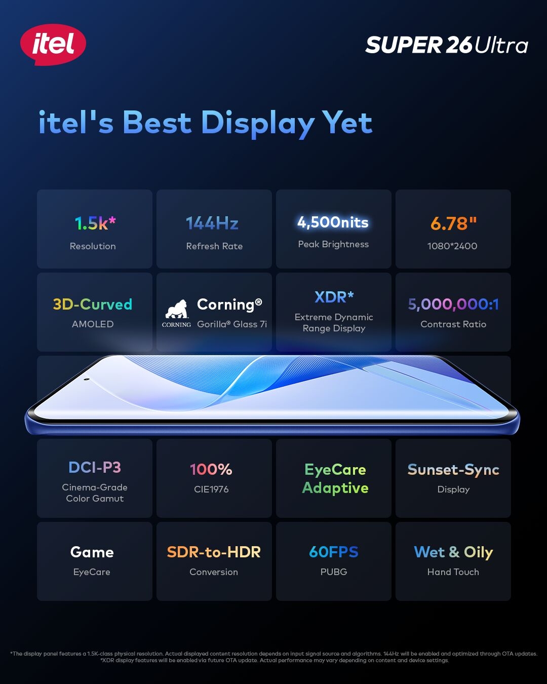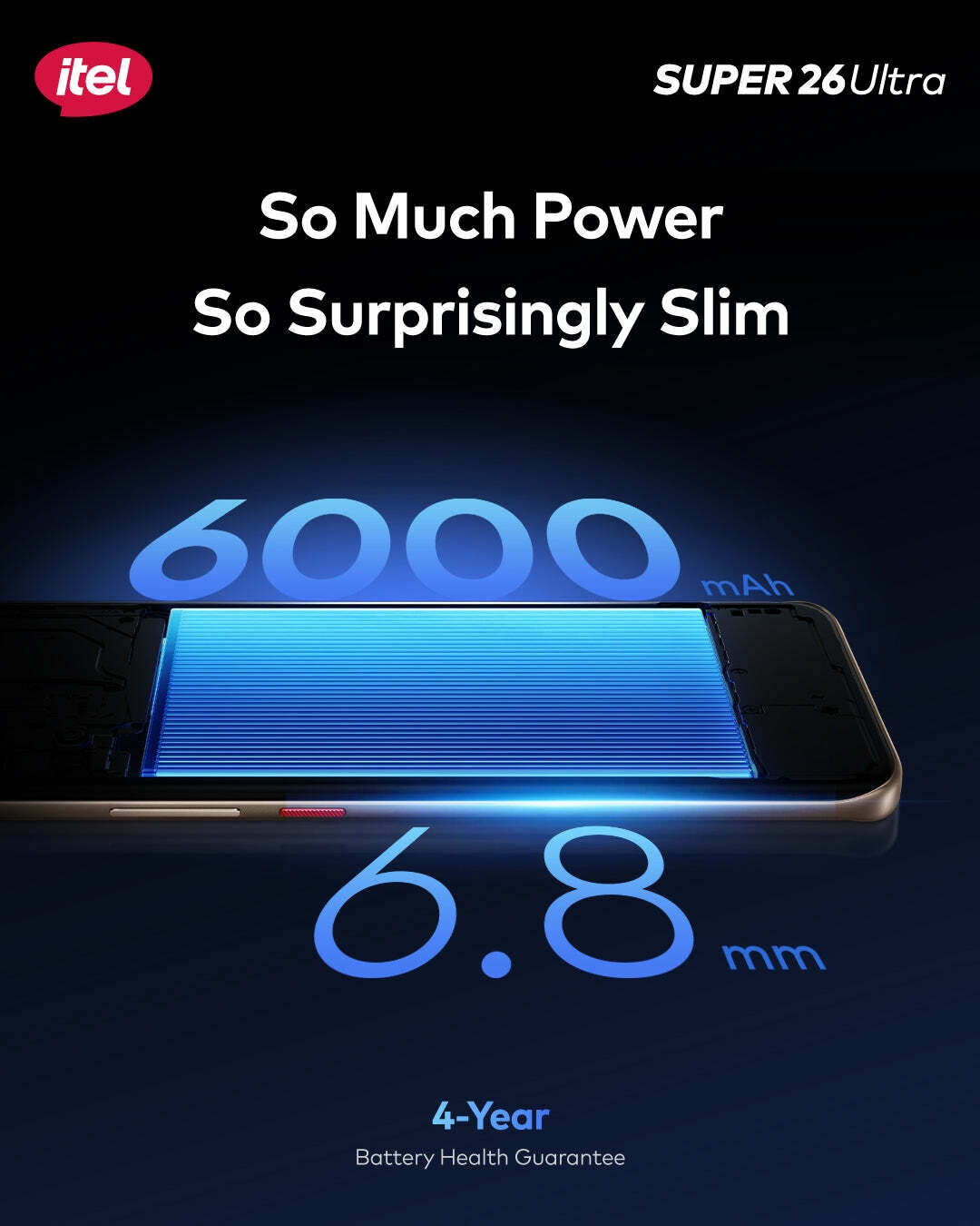 itel Super 26 Ultra Experience elegance and power in one sleek package. Featuring a stunning 6.75" 3D Curved AMOLED display with ultra-smooth 144Hz refresh rate and crisp 1.5K resolution, protected by Corning Gorilla Glass 7i. Built for endurance with 6 years of fluency, a slim 6.8mm body, and IP65 water resistance. Powered by a 6000mAh battery and a lightning-fast T7300 6nm processor, it handles everything with ease. Enjoy smart IR control, immersive DTS audio, and 128GB/256GB of storage for all your needs.