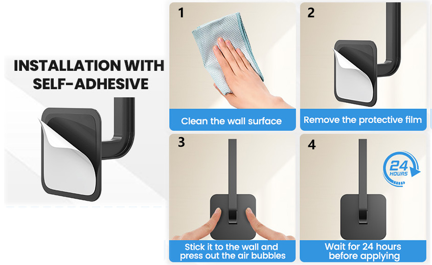 Easy installation: Simply peel off the protective film from the self-adhesive tape on the back and firmly press it onto the clean, dry wall for at least 10 seconds to complete the setup. Wait for 24 hours before using the cap rack hat organizer to ensure maximum efficiency.