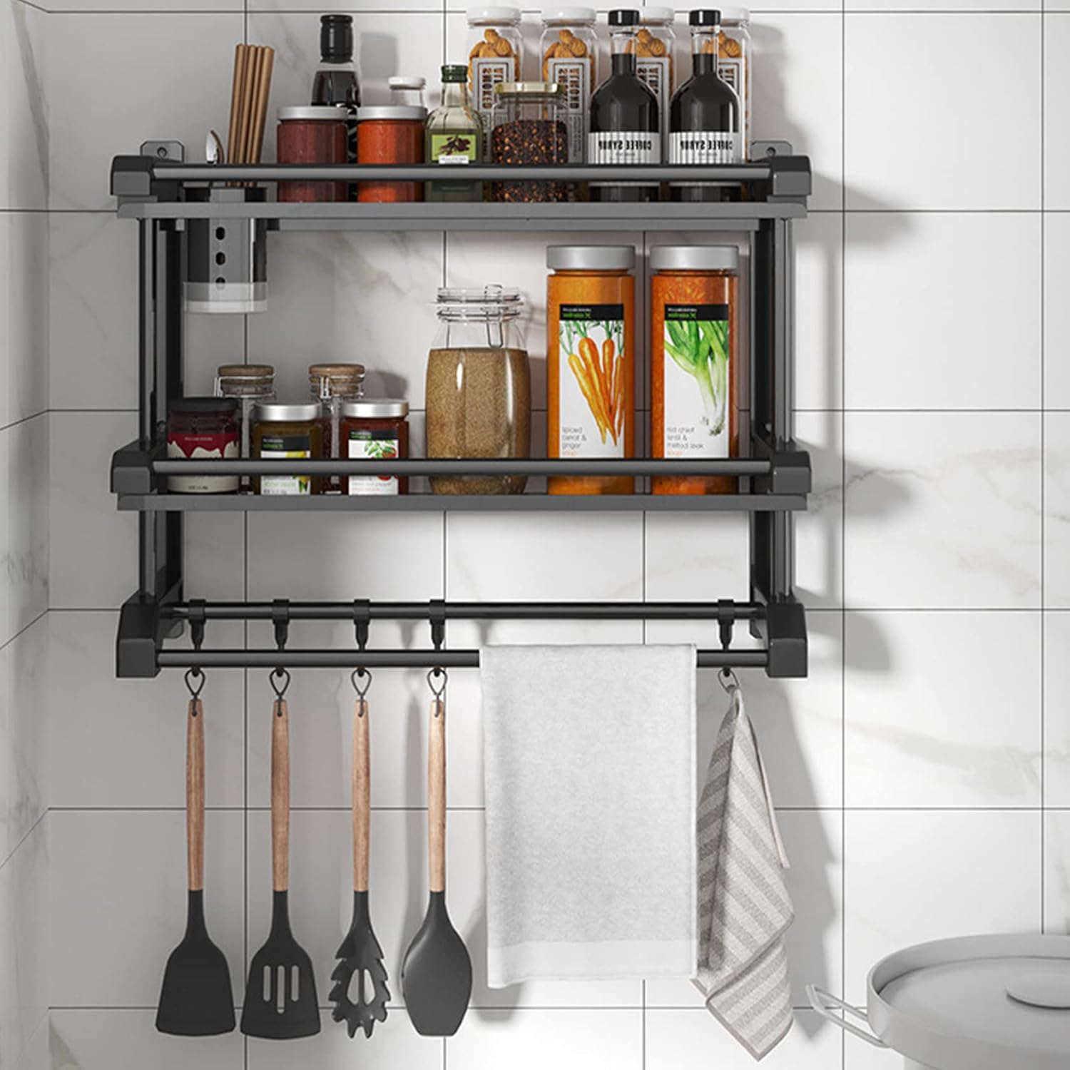 The upper layer of this wall-mounted shelf provides ample space for storing toiletries, while the lower layer features a dual-bar towel rack and 5 hooks, perfect for hanging towels and small items.