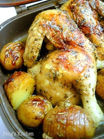 Ingredients 1 whole chicken (cut along the breasts bone to open up like a butterfly)1 tsp salt1/2 tsp black pepper2 tsp dried mixed herbs1 tsp dried rosemary1/2 tbsp olive8 brastagi potato1/2 tsp salt1/4 tsp black pepper1 tsp mixed herbs1 tsp olive oilMethodMarinate chicken, preferably overnight.Make slices along the length of the potatoes do not slice all the way through. Leave at least a half an inch at the bottom to hold the rounds together. Add in seasoning and toss evenly to coat the potatoes.Heat Happy Call Pan (HCP) and place in the chicken, chicken breast facing up. Arrange the potatoes around the chicken.Close the pan and cook over medium-low heat for 15-20 mins. Shift the pan twice at the last 10 mins.Flip the pan (breast side will be down now). Open the pan slightly to check, it should look golden brown. Lock the pan and cook for another 15-20 mins.Flip back the pan, open and check. It should be golden brown and crisp looking.To get the desired colour, flip HCP and cook for another 2-5 mins each time until the desired colour is achieved.
