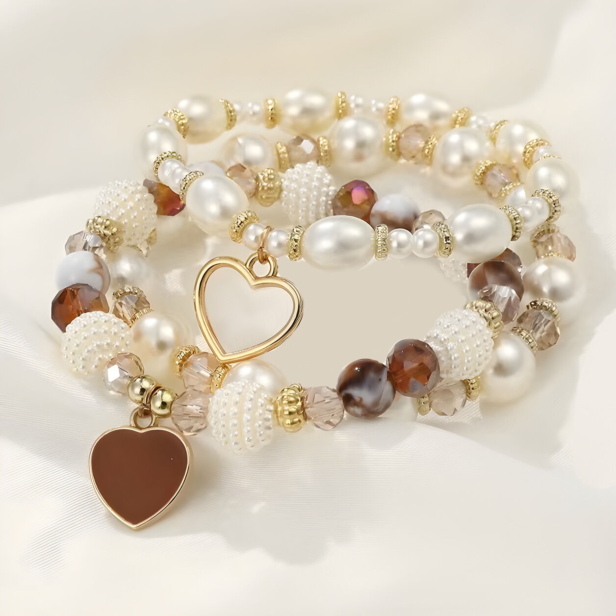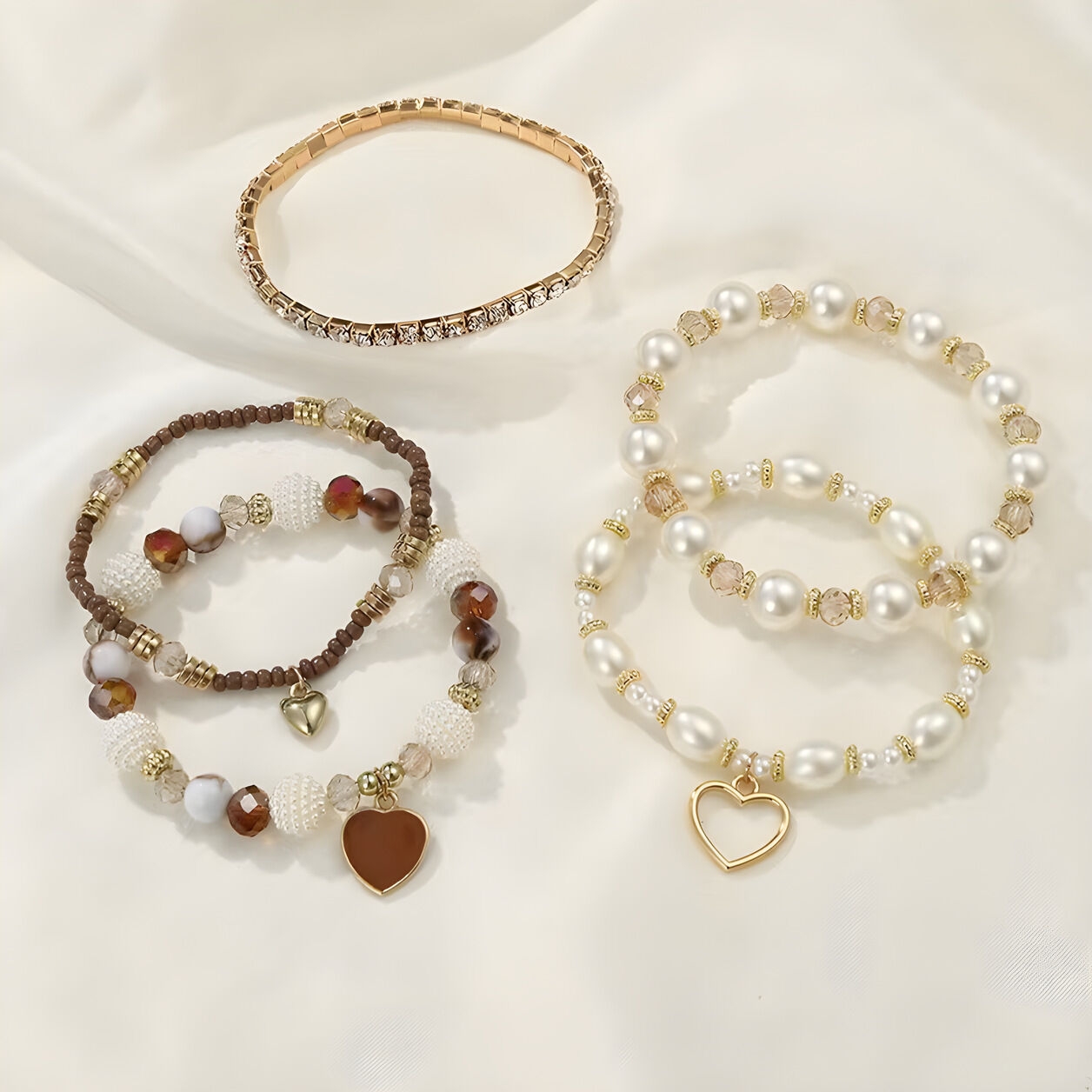 This five-piece bracelet set blends the free-spirited nature of Bohemia with vintage aesthetics. The multi-layered design is crafted from select copper alloy, imitation pearls, and colorful beads, adorned with heart-shaped embellishments. The hand-beaded technique gives it a unique texture.