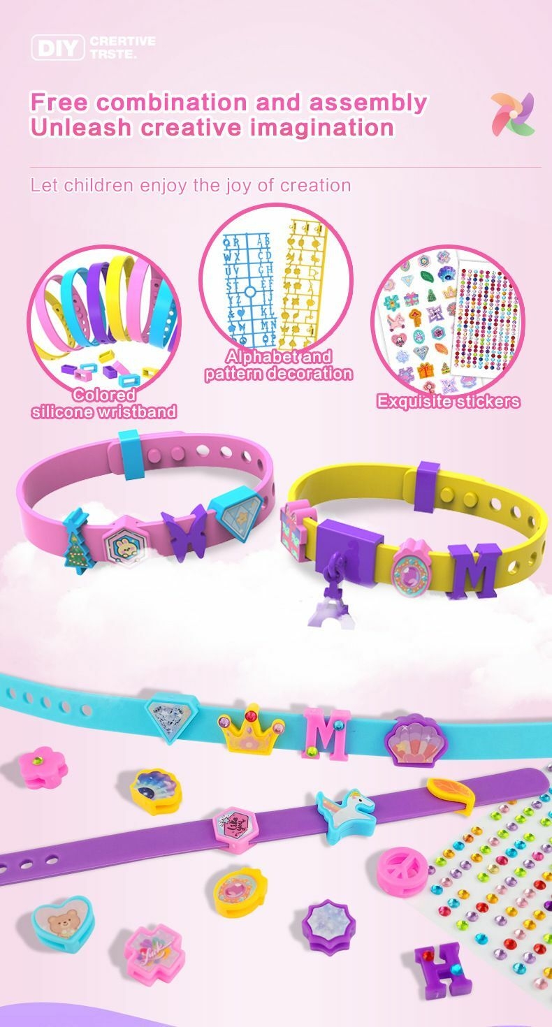 2、Crafted from child safe silicone and plastic materials, this includes adjustable wristbands, 4 threading tools, and a storage box for organized play.