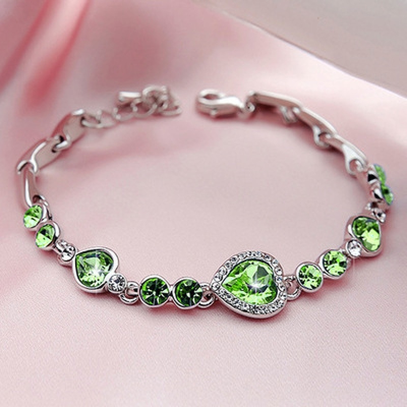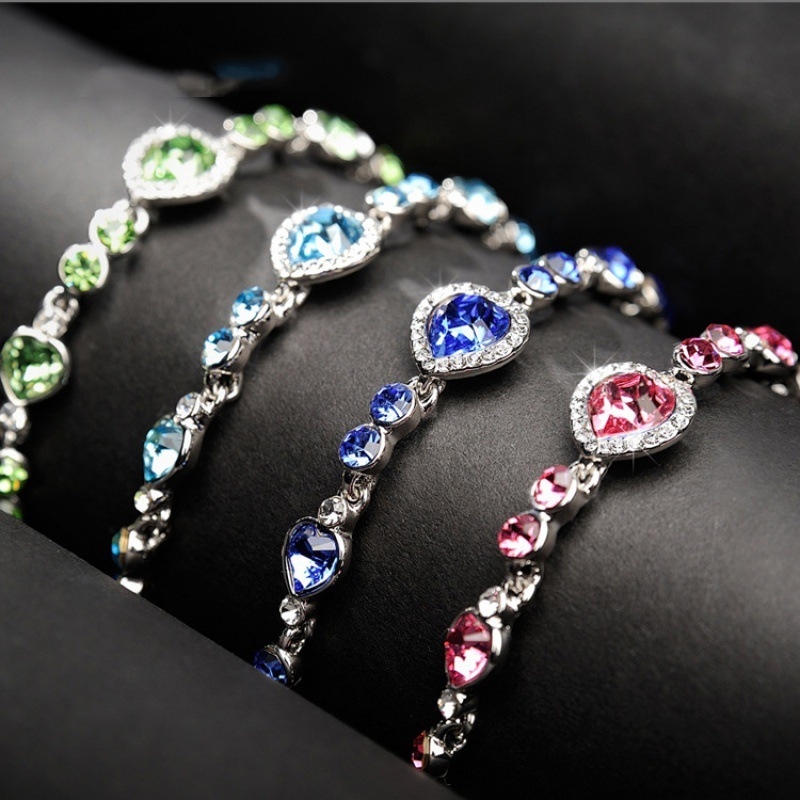 This women's bracelet is full of sweetness. The bracelet is mainly pink, with delicate pink heart-shaped crystals and round rhinestones, which are staggered on the metal chain. The largest heart-shaped crystal is surrounded by sparkling small diamonds, which attracts the eye like stars holding the moon. The metal part may be made of alloy, which is finely polished with soft color and delicate texture. The overall design is dreamy and romantic, like a fairy tale accessory, suitable for adding highlights to sweet and Lolita styles.