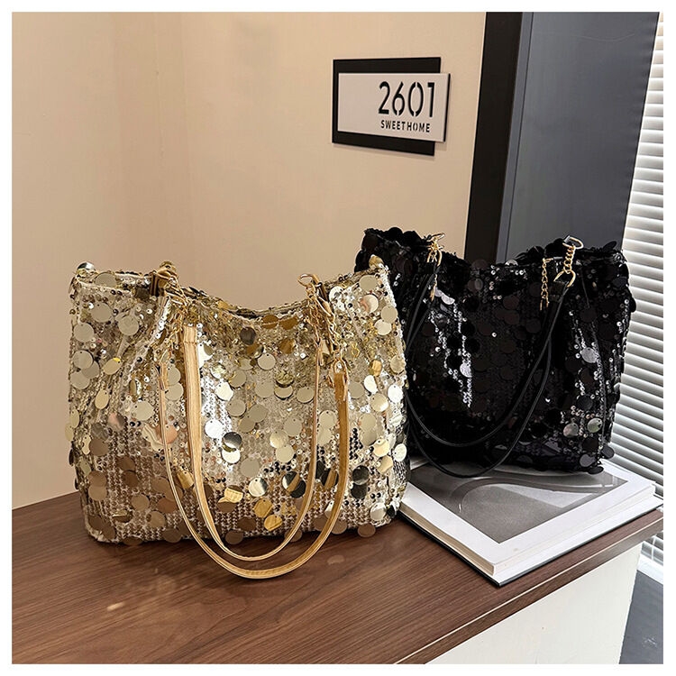 Glistening sequin exterior paired with a delicate metal chain for eye-catching yet refined elegance. Compact design fits essentials perfectly, ideal for evening parties or upscale events—effortlessly embodies understated luxury.