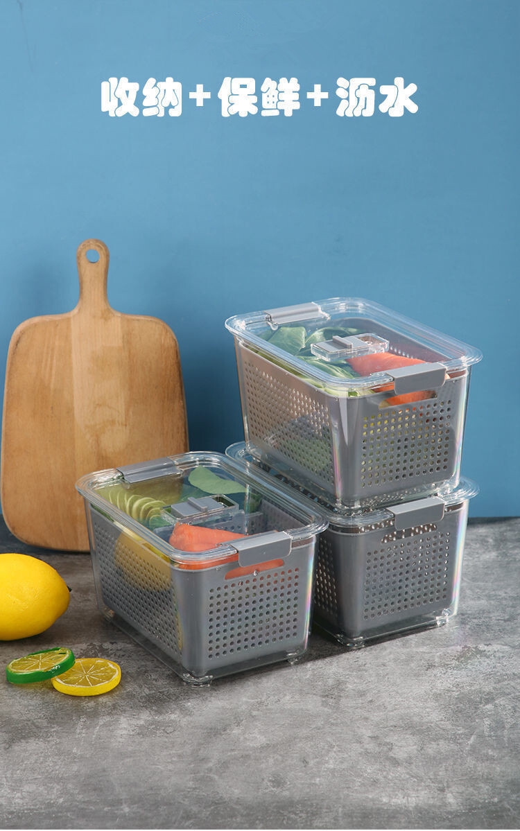 Refrigerator storage box, designed to revolutionize the way you store and preserve your fruits and vegetables. our storage box features a convenient drain basket that makes cleaning and draining a breeze, ensuring your produce stays fresh for longer.