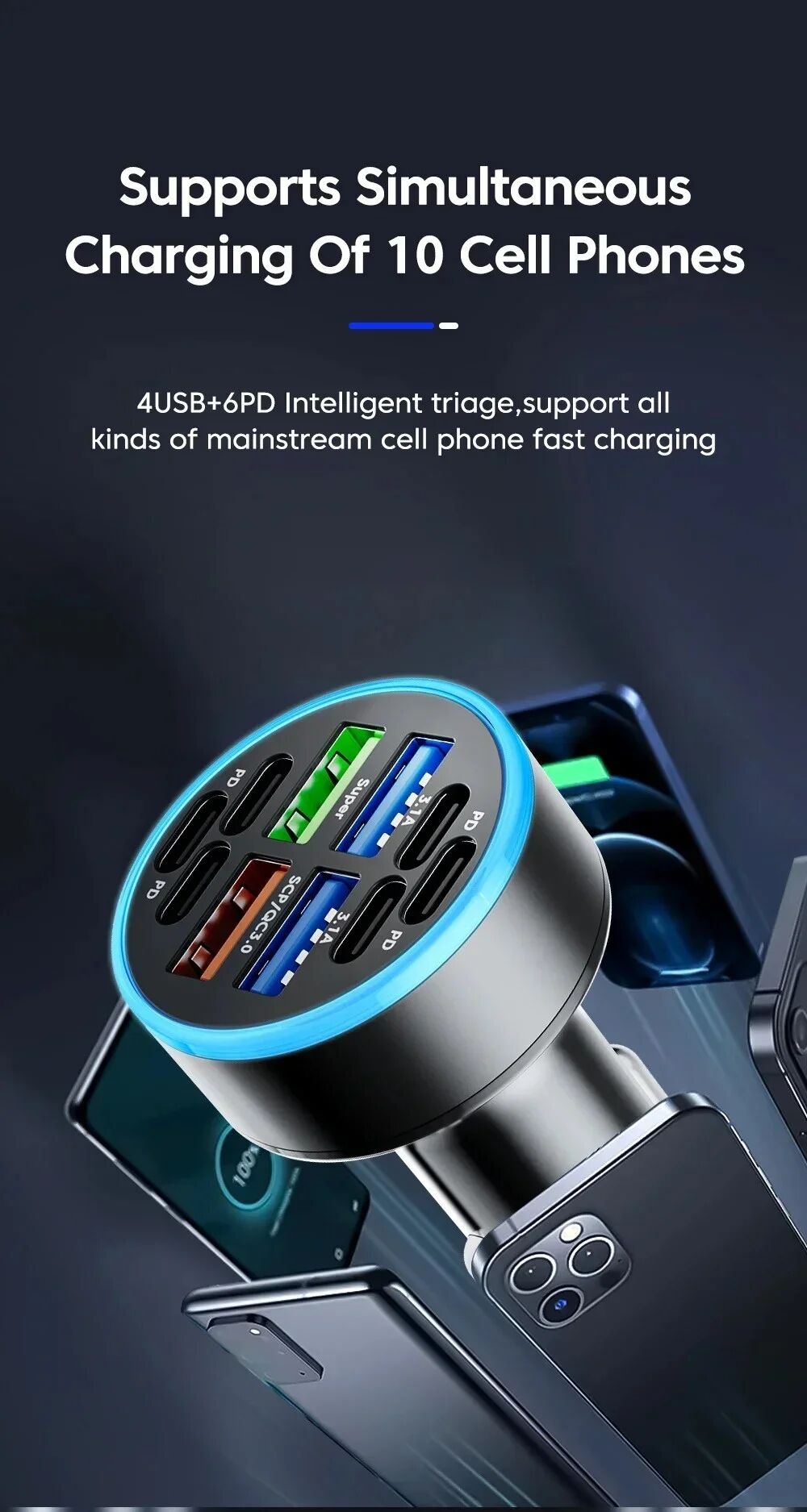 1.100W high power output: This car USB charger has an output power of up to 100W, which means that it can quickly charge various devices at the same time, including mobile phones, earphone, wrist watch, etc.
