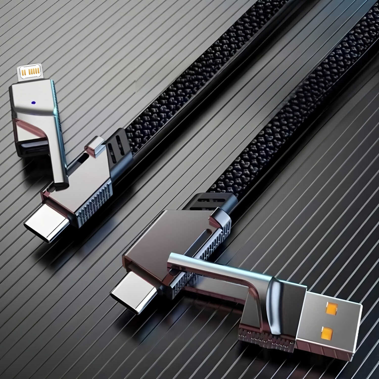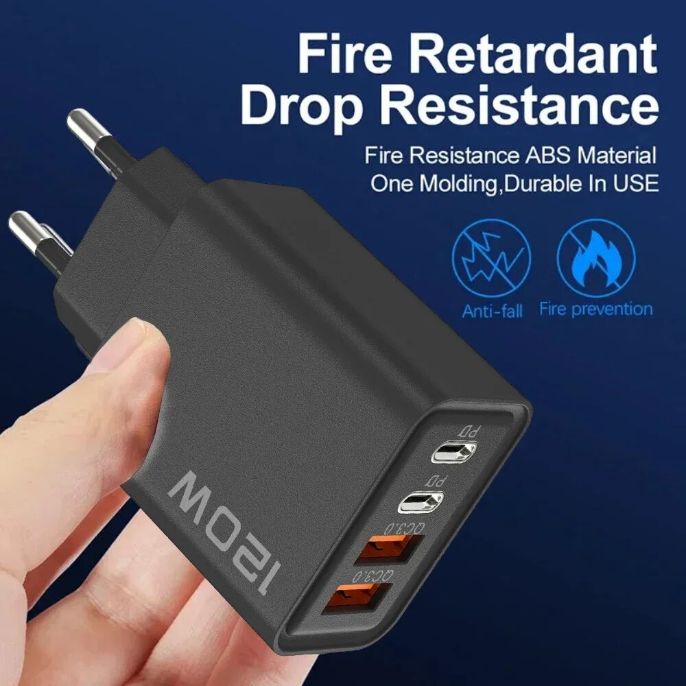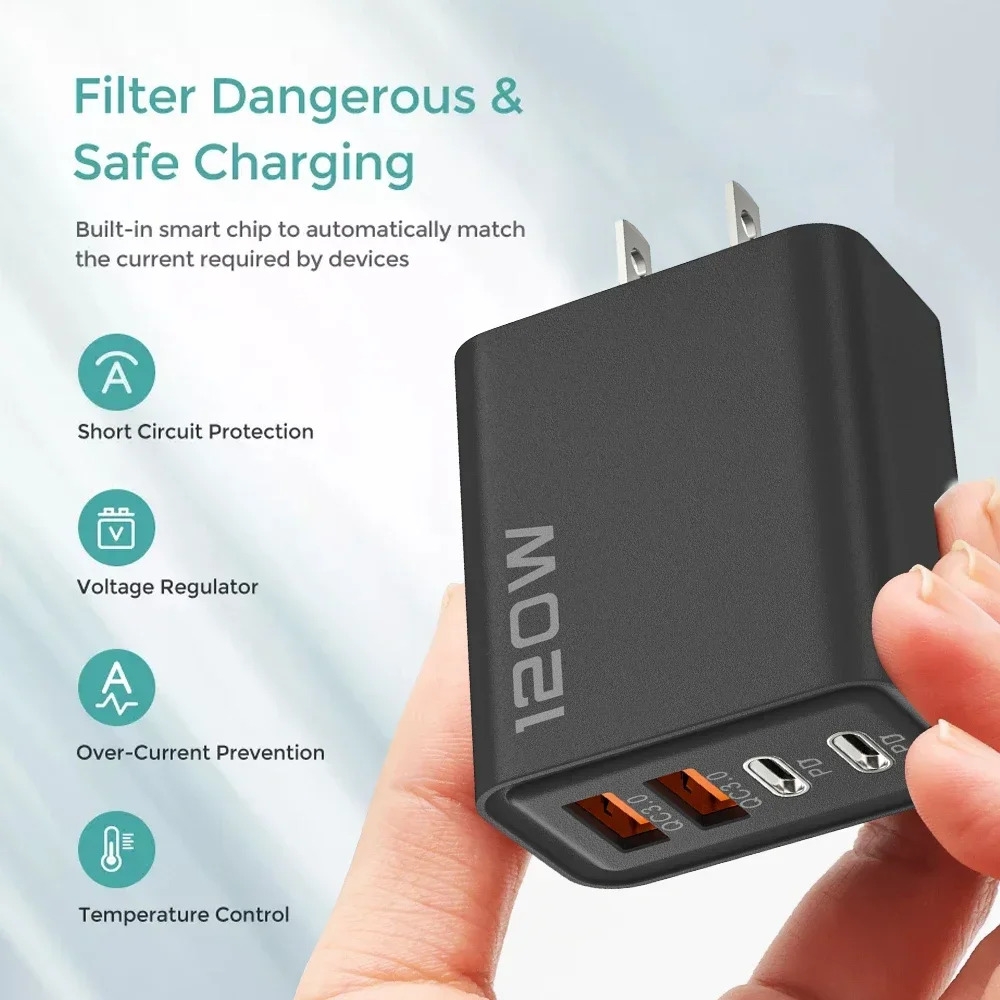 120W Type-C Fast Wall Charger+4 in 1 Super Fast Cable for iPad Phones Description: Our 120W fast charger uses advanced technology to achieve efficient charging, which can significantly shorten the charging time while ensuring fast and stable charging. 4-port design with maximum charging efficiency saves time, energy and effort. The 4-in-1 Super Fast Cable combines four ports (USB A to C, USB A to Lightning, USB C to Lightning and USB C to USB C cable) into one. No need to carry multiple cables for different devices. Charge your electronic devices such as mobile phones, tablets and laptops quickly and efficiently with our 120W fast charger, suitable for a variety of devices and ensure that your technology is always available. Features: 1. Fast Charging: Our 120W fast charger uses advanced technology to achieve efficient charging, which can significantly shorten the charging time while ensuring fast and stable charging. 2. Four-port efficiency: Our 4-port design conducts electricity autonomously between your devices, ensuring the optimal charging power for each device. Save time, energy and effort with our highest charging efficiency. 3. Efficient Performance: With advanced gallium nitride chip technology, this 120W fast charger consumes less power, ensures safer charging, reduces heat generation, and significantly reduces size and weight, bringing you an efficient charging experience. 4. Shatterproof Structure: Made of sturdy PP material, this 120W fast charger has excellent drop resistance, ensuring long-term stability without worrying about breakage. Due to its good durability, it is a reliable companion for all your charging needs. 5. Wide Applicability: Use our 120W fast charger to quickly and efficiently charge your electronic devices such as mobile phones, tablets and laptops, suitable for a variety of devices and ensure that your technology is always available. 6. 4-in-1 Super Fast Cable with Case: This cable is designed with the concept of simplifying your life. Combine four ports (USB A to C, USB A to Lightning, USB C to Lightning and USB C to USB C cable) into one. No need to carry multiple cables for different devices. Specifications: Product: charger + charging cable Color: Black charging head + black charging cable Maximum output power: 120w Material: PC + ABS flame retardant material Size: [plug] about 8.73*4.58*2.85cm [charging cable] about 1.5m Product interface: USB/Type-C to MicroUSB/iPhone/Type-C Package content: Charger*1 Four-in-one charging data cable*1