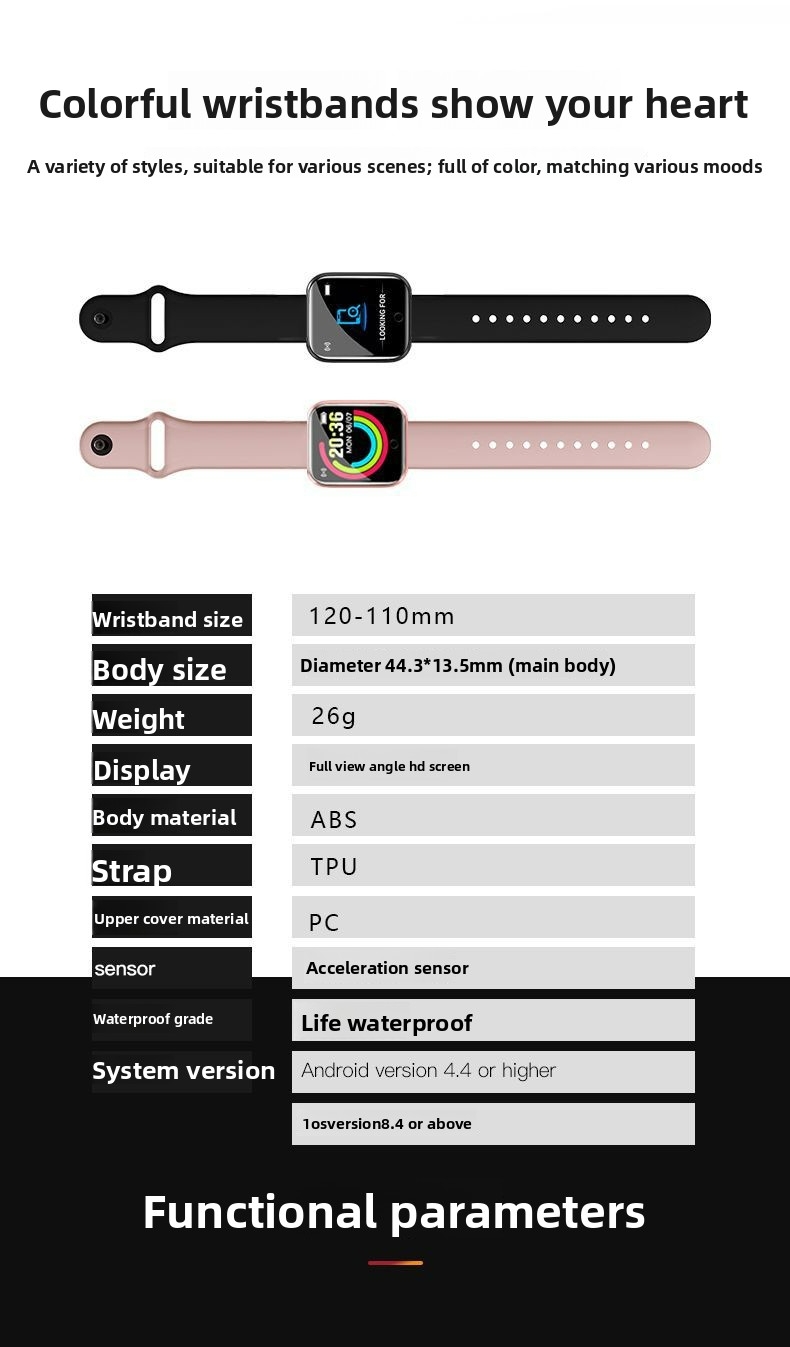 Key FeaturesCompatible Platform: AndroidAppropriate for: Adults, Men, Teenagers, CouplesAppearance size: 11.4*36.4*42Battery capacity: 50 mAhProduct Weight: 50GOperation Mode: TouchWireless Distance: 5M (Inclusive)-10M (Inclusive)Wristband Material: TpuPacking list: bracelet + manual + packaging boxFunctions: Photo Taking, Step Counting, Heart Rate Monitoring, Blood Pressure Measurement, Smart Reminder, Remote Control Selfie, Sleep Monitoring, Blood Oxygen DetectionColor: y68, Black Type of Communication: Plug-in Card Not EnabledBattery Life: Less than 7 DaysCharging Method: Usb ChargingWaterproof Grade: Life WaterproofWatchcase Material: PlasticScreen Type: Tft ScreenWatch Strap Style: Modern Style BuckleMold Type: Male DieVersion Type: US