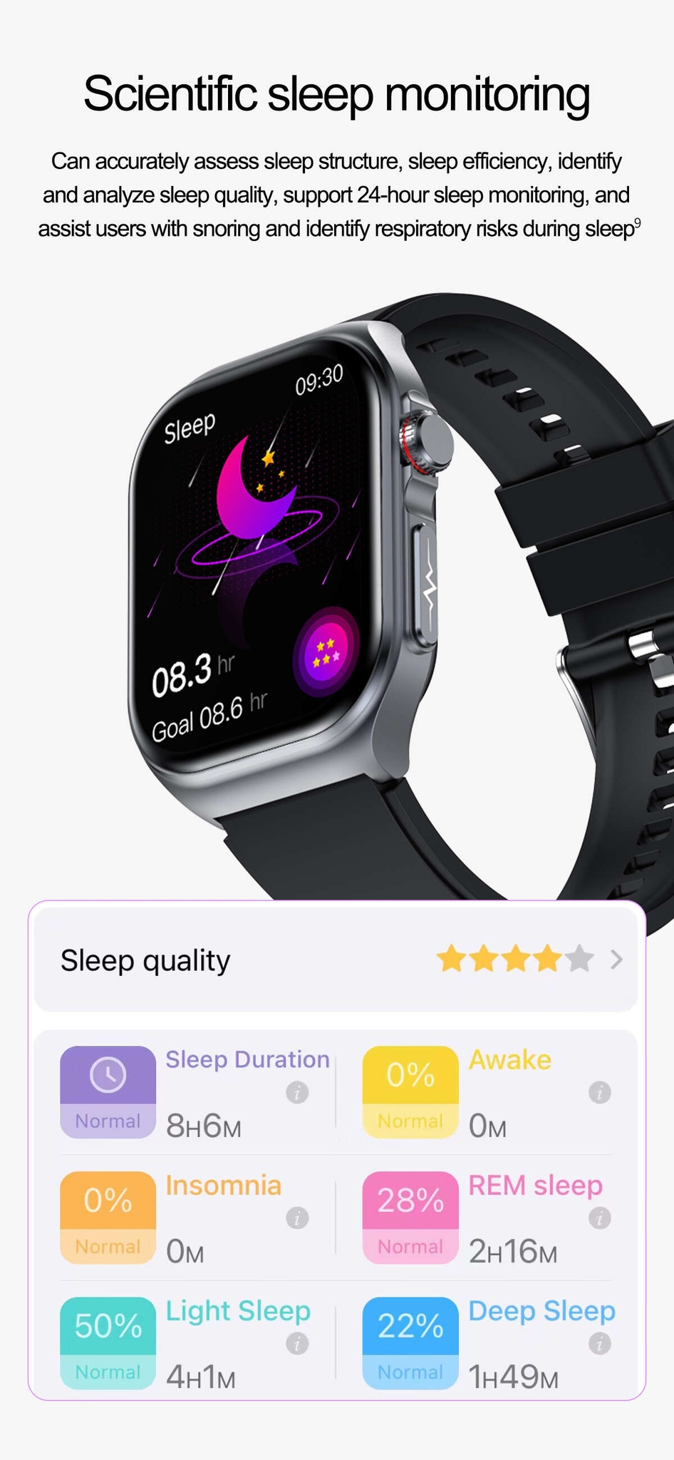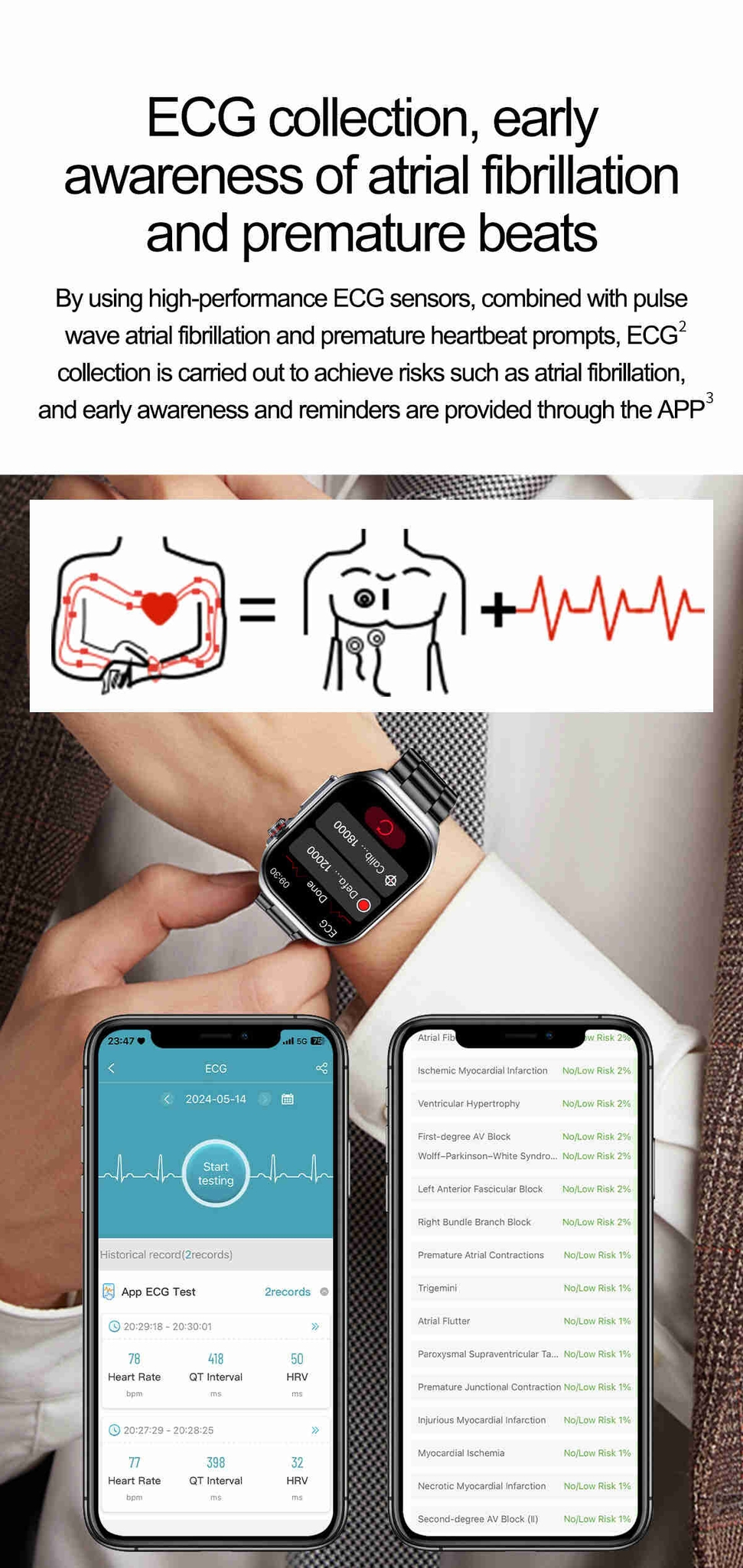 2.04-inch 368 * 448 AMOLED full touch screen, Bluetooth calling, ECG electrocardiogram, micro physical examination function, HRV detection, emotion detection, fatigue detection,, blood composition measurement (uric acid and lipid function), body composition measurement (BMI), Merton function, SOS emergency call function, blood oxygen monitoring, blood pressure monitoring, respiratory training, women's health (menstrual tracking), heart rate monitoring, sleep monitoring, temperature monitoring, sedentary reminder, etc.