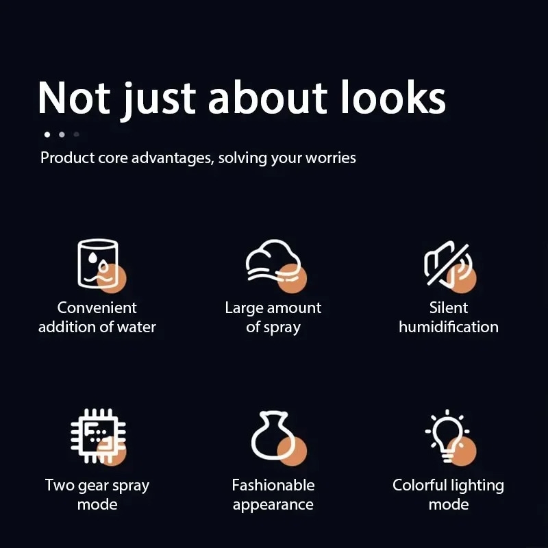 1.Portable mini humidifier:The design of the colorful atmosphere light,Portable and small design(4.57*5 inch) is very easy take with you anywhere and super perfect for travel,bedroom,office, which is effectively moisturize dry skin and help you reduce skin peeling.
