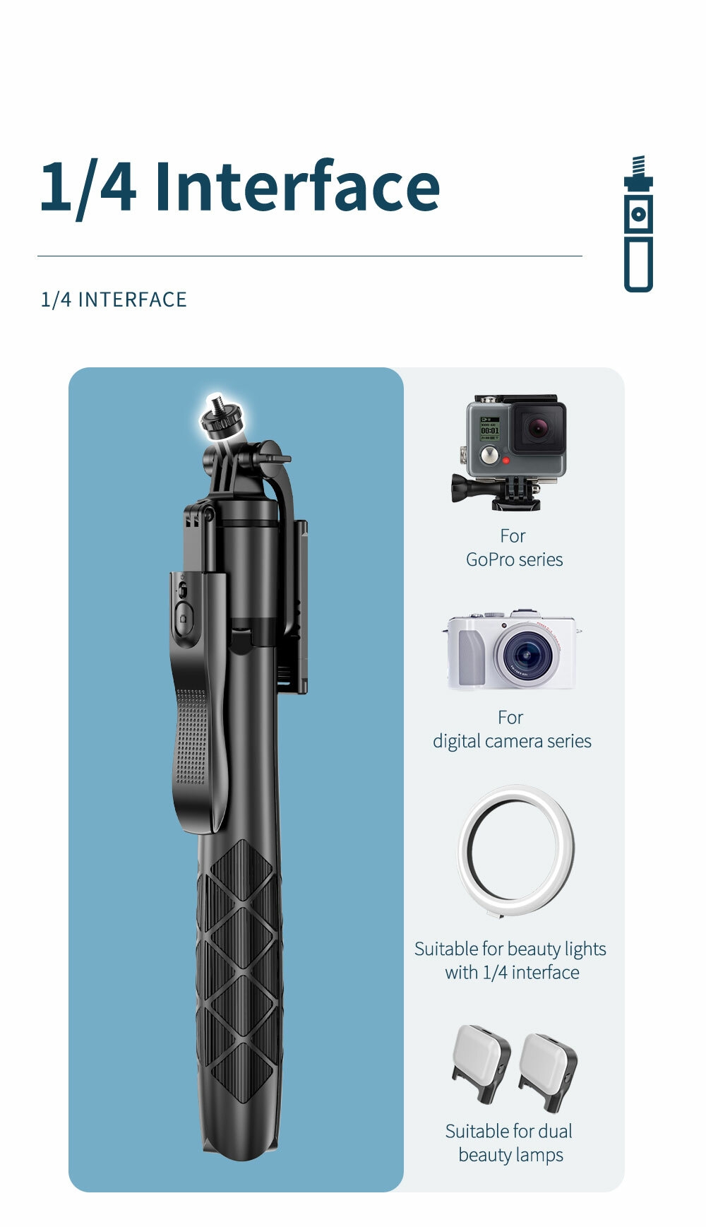 4. Extra available accessories - led fill lights, ring light, 1/4 screw for action camera, please contact us if you need them.