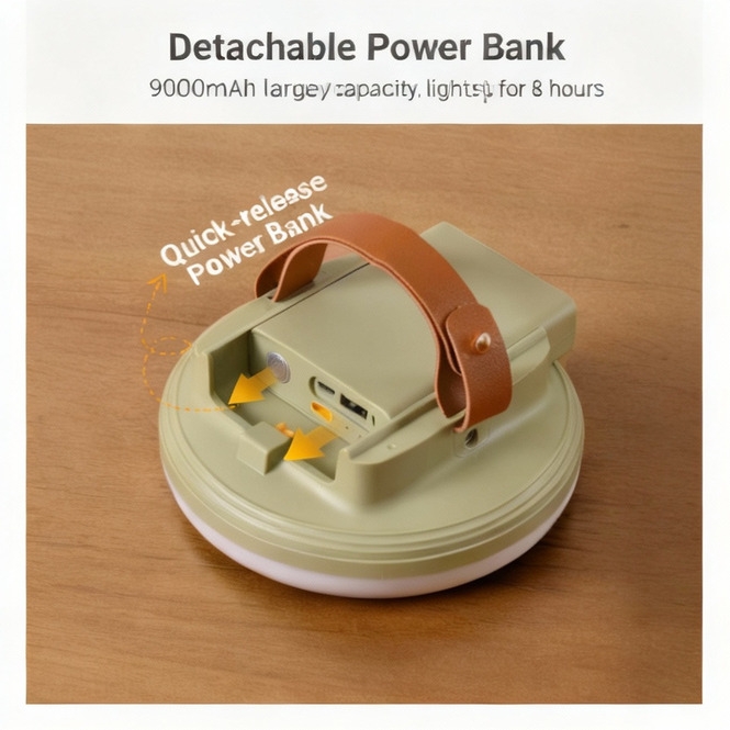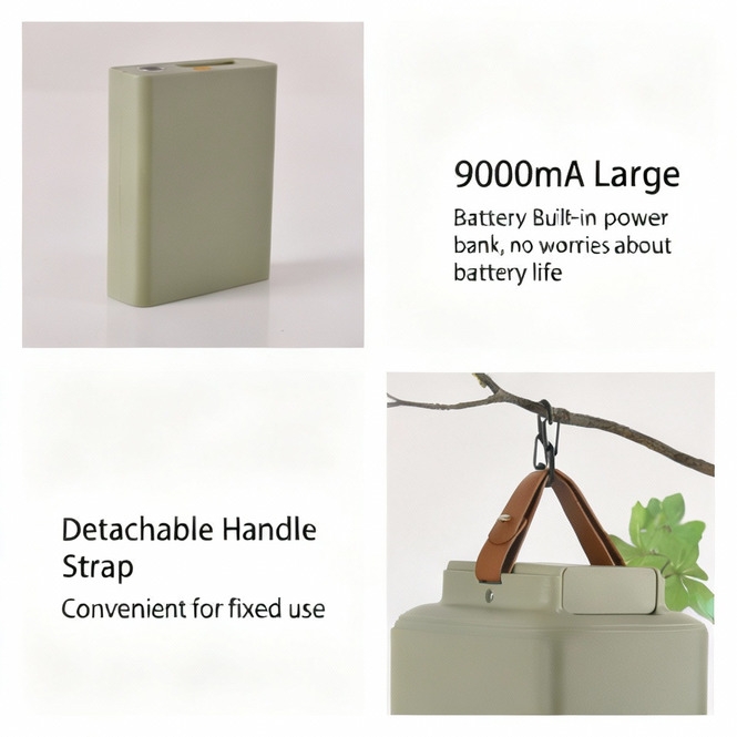 • 9 000 mAh detachable power bank – run the lamp for 8 h or top-up two phones at once via USB-A & Type-C ports