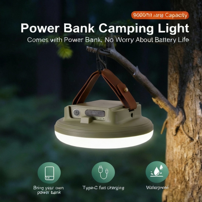 9000mAh Waterproof Camping Lantern & Power Bank 3-Light Modes Type-C Fast Charge