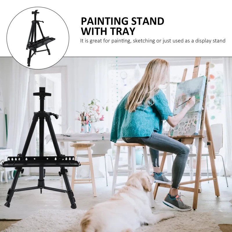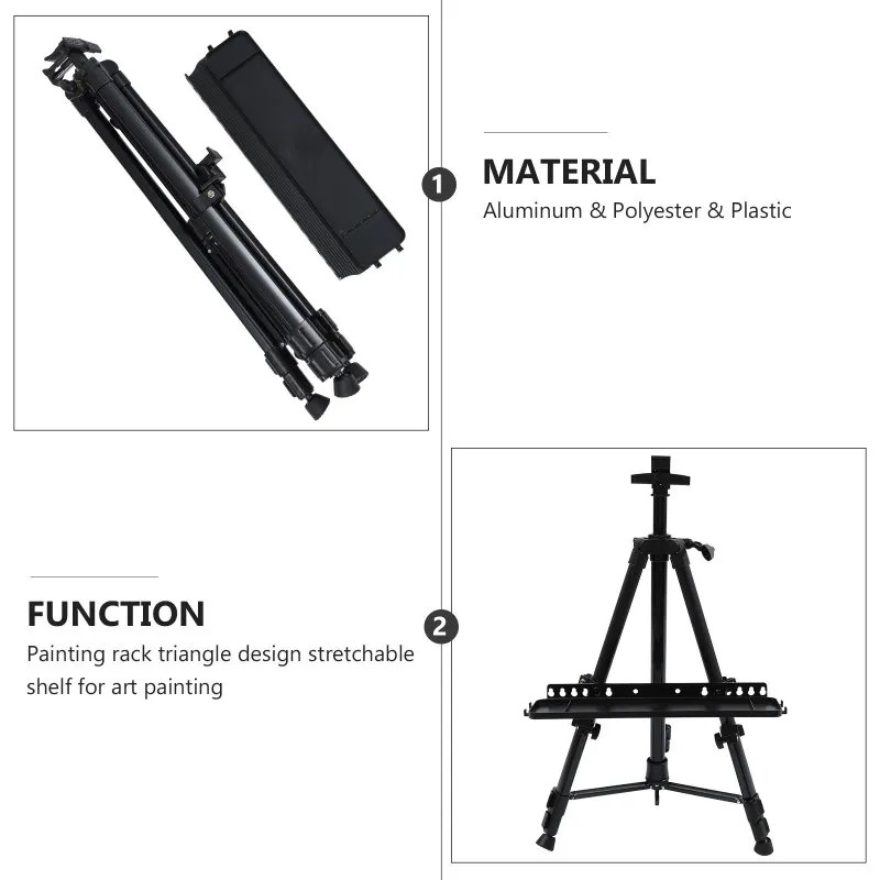 Metal Easel: Adjustable Artist Tripod with Tray - Black Aluminum Display Easel is sturdy, lightweight, and portable, making it an ideal choice for artists, presenters, and exhibitors. Its high stability and easy portability make it ideal for all your creative needs.