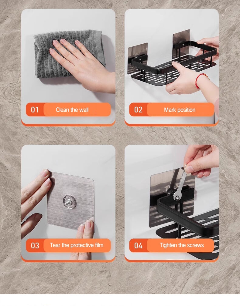 *More Adhesive, Easy To Install, No Drilling Required: Installation Only Takes A Few Minutes, No Drilling Or Any Tools Needed, And Will Not Damage The Wall.Clean The Surface, Stick The Adhesive To The Wall, And Hang The Shower Rack For Use.Suitable For Smooth Surfaces Such As Tiles/Marble/Glass/Metal, But Not Suitable For Uneven Surfaces Such As Painted Walls.