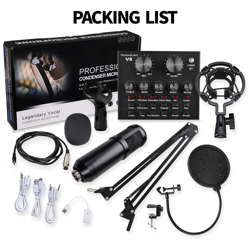 Packing A List:1x V8 Live sound card1 x BM-800 condenser microphone1 x Adjustable Microphone Stand1 x Nylon filter1 x Faux Plastic Shock Mount1 x Micro windshield1 x XLR female to 3.5mm microphone cable1 x Micro USB to 3.5mm Cable1 x English user manual