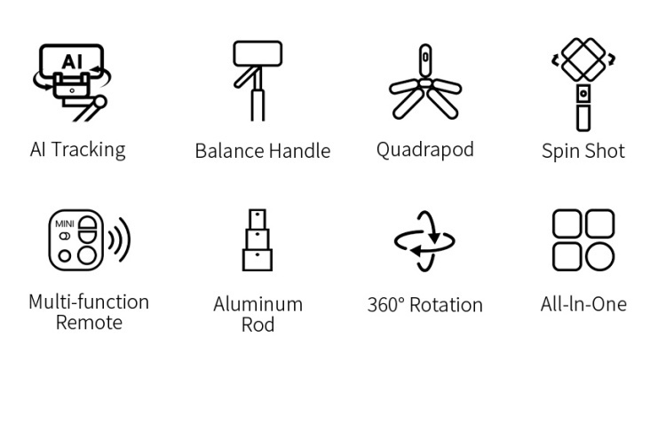 1. Independent lens, Ai intelligent tracking. 2. Intelligent anti-shake core, shoot while walking. 3. 3-in-1, not only tracking gimbal, but also quadrupod and selfie stick. 4. Balanced anti-shake shooting handle. 5.Detachable multi-function remote control, with APP, shooting more interesting. 6.Adjustable stable quadrupod. 7.High-end stable aluminium alloy pole.