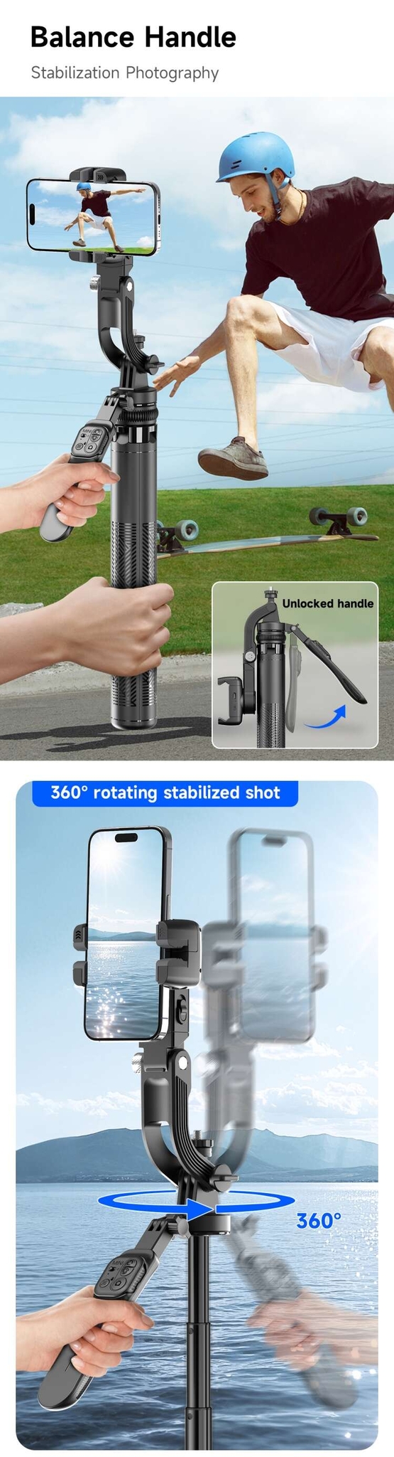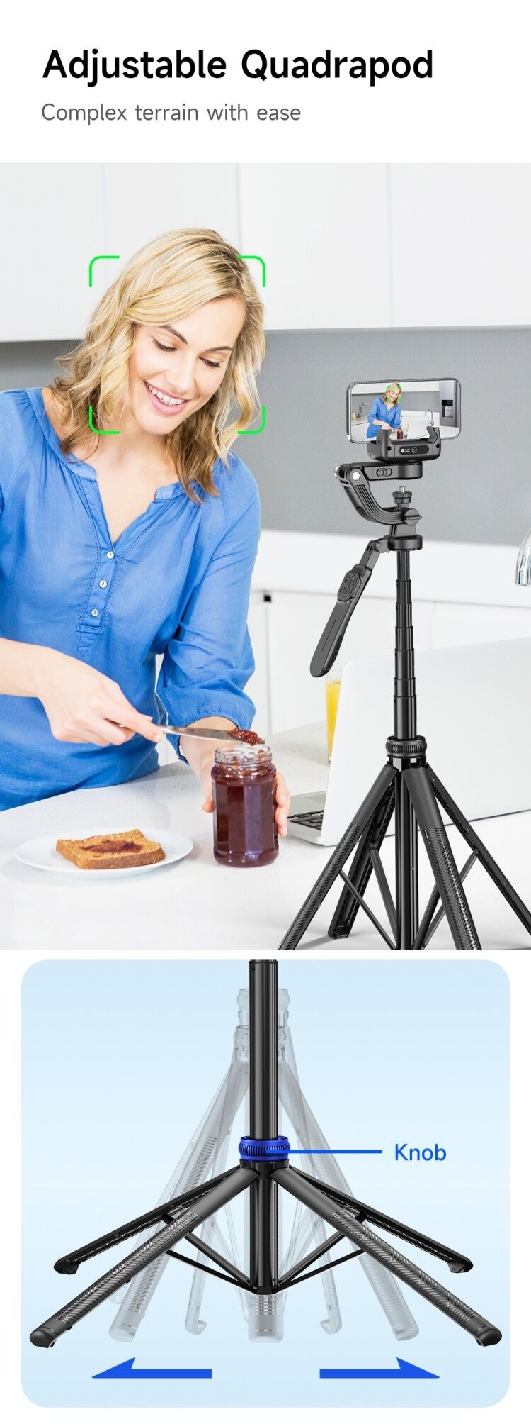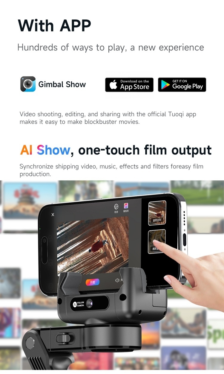 1. Independent lens, Ai intelligent tracking. 2. Intelligent anti-shake core, shoot while walking. 3. 3-in-1, not only tracking gimbal, but also quadrupod and selfie stick. 4. Balanced anti-shake shooting handle. 5.Detachable multi-function remote control, with APP, shooting more interesting. 6.Adjustable stable quadrupod. 7.High-end stable aluminium alloy pole.
