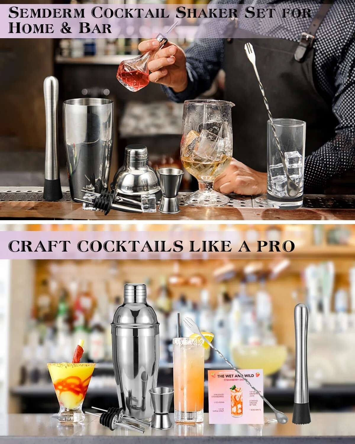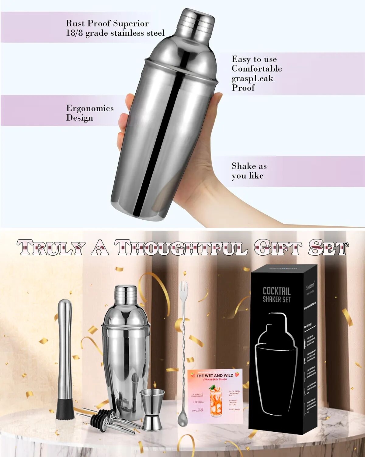 - Fashionable, leak-proof, and exquisite, this cocktail shaker is crafted from high-quality stainless steel. With its superb craftsmanship, it is sturdy, durable, and leak-resistant, featuring a beautiful appearance. Both amateur and professional bartenders can use it with great convenience.