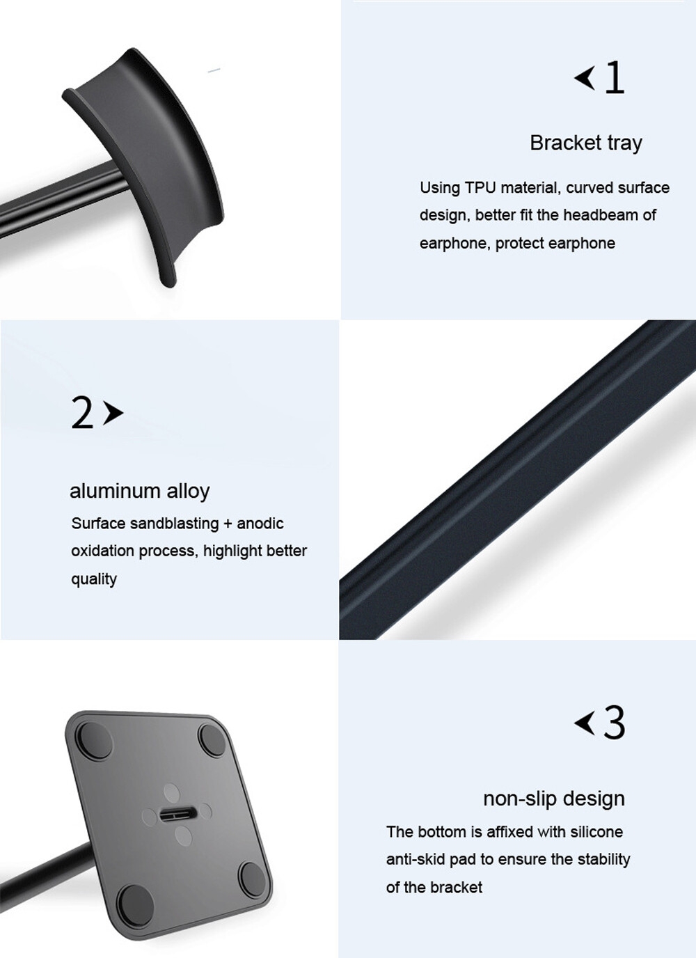 - 2. Styling: The curved bracket fits snugly against the headphone headband, with ergonomic design to prevent deformation;