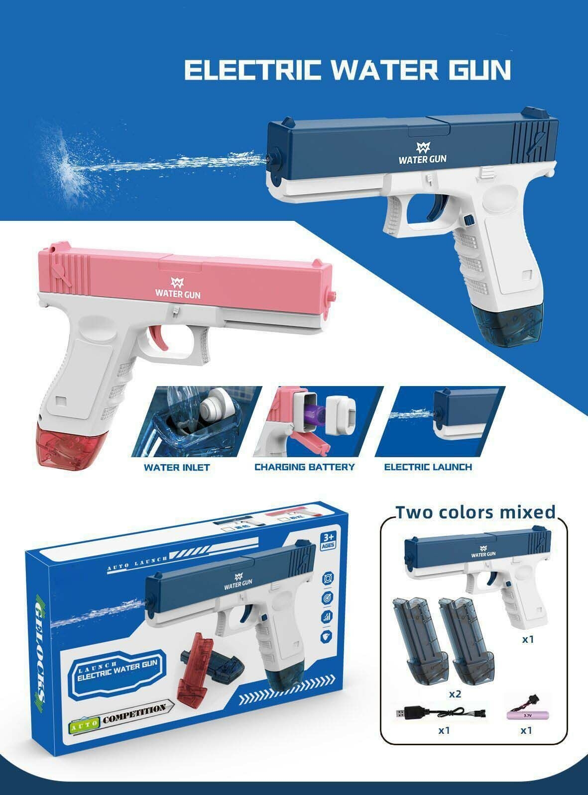 ELECTRIC DESIGN -- The newest electric watergun which is used to relieve the pressure of finger pulling the trigger. Cool toy gun appearance will attract the attention of children. Pink and Blue