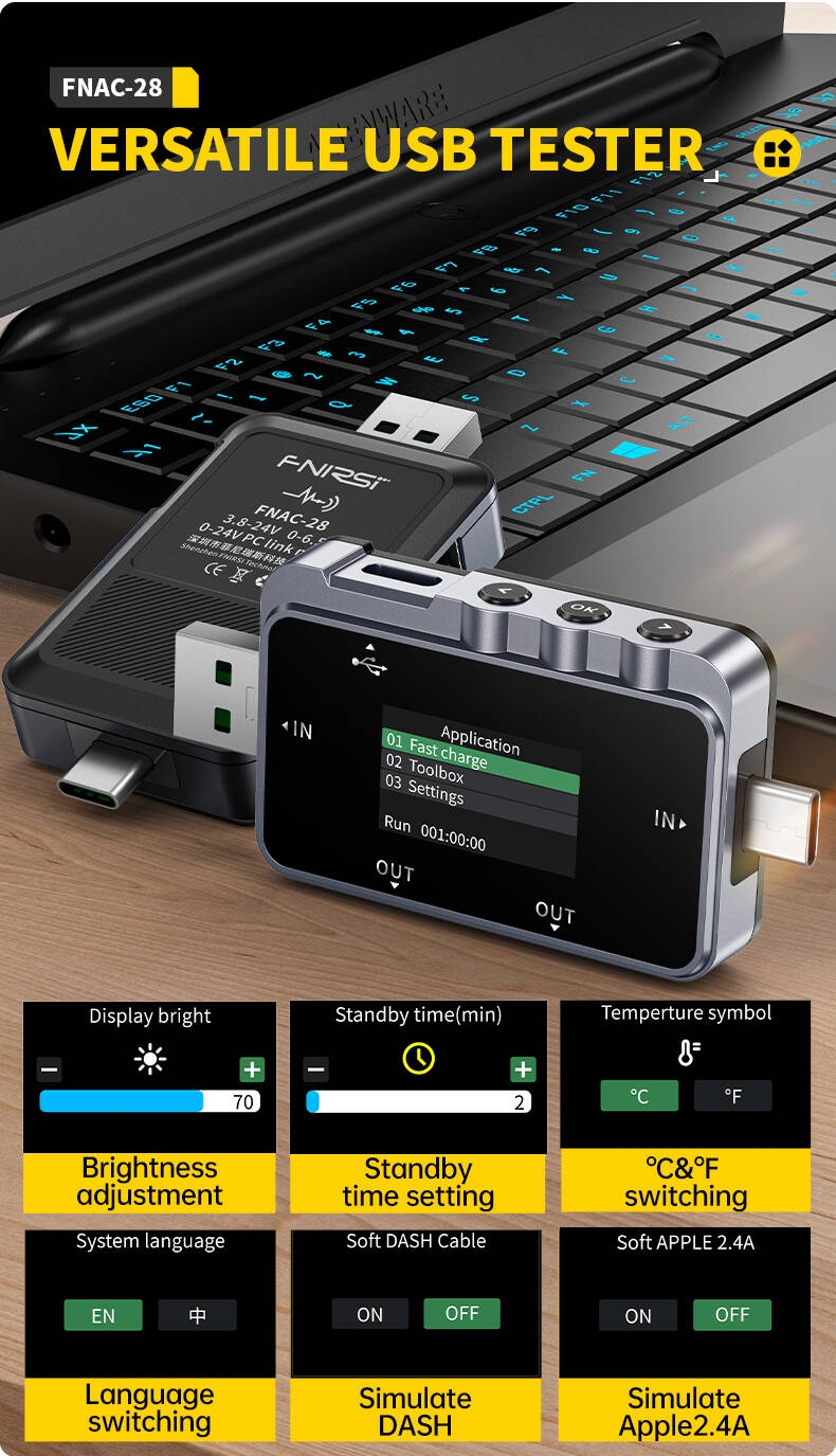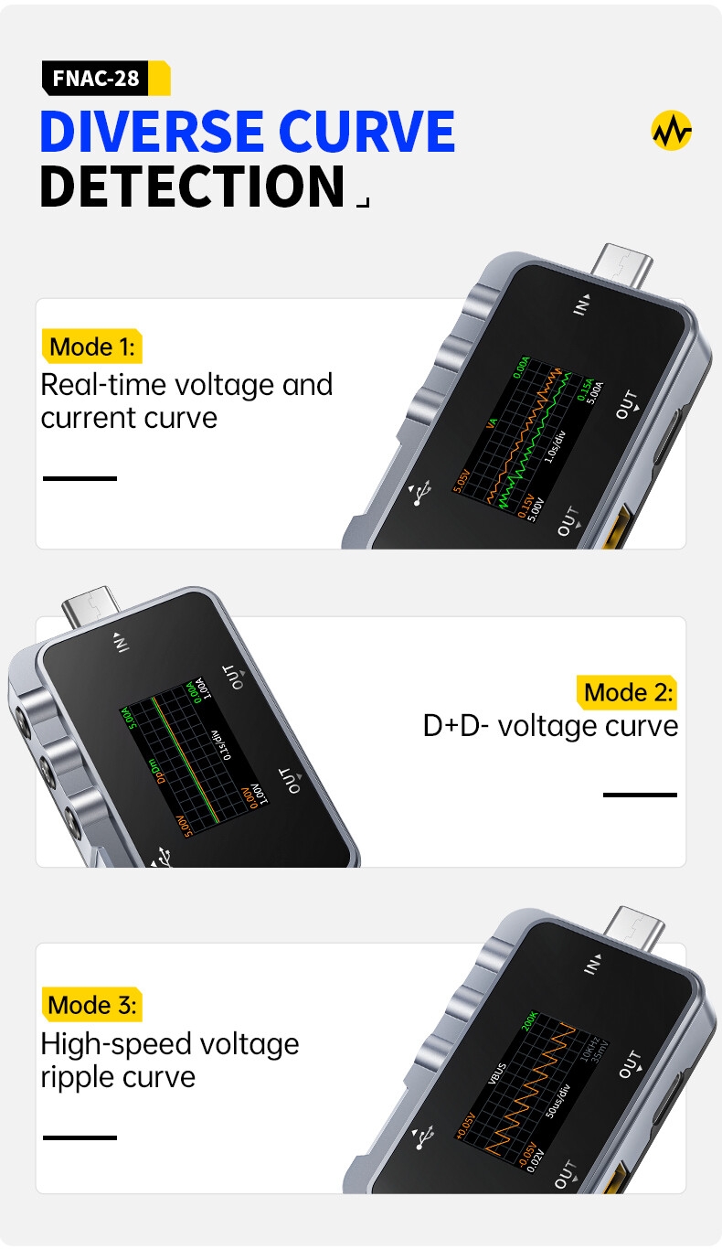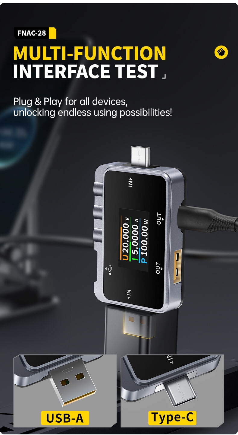 The FNAC-28 USB Tester is a multifunctional USB voltage and current meter, as well as a quick charge trigger device for mobile communication terminals.