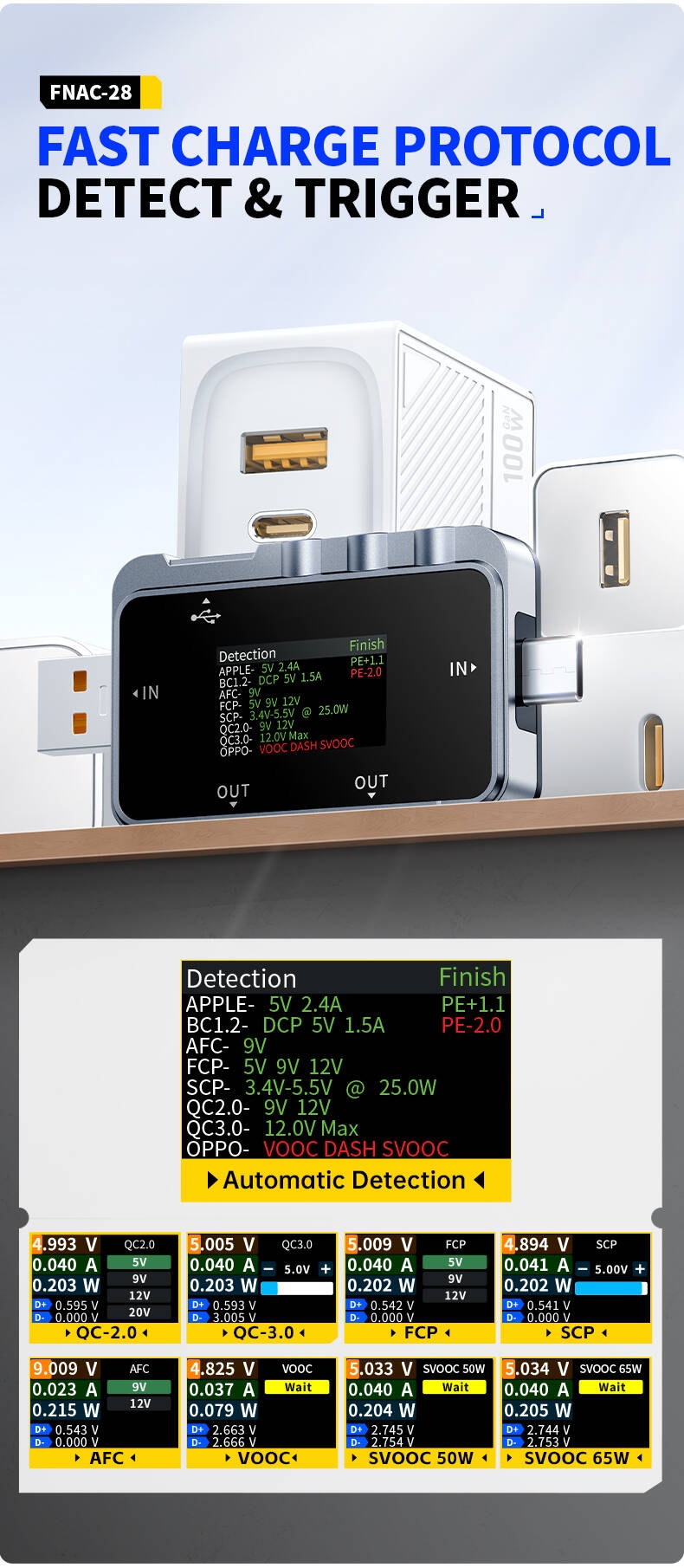 Protocol Detection: ①QC2.0 5V 9V 12V 20V; ②QC3.0 3.4-20V; ③FCP 9V 12V 20V; ④ SCP 5.5-6.0V; ⑤AFC 9V 12V; ⑥VOOC/WARP 20V; ⑦SVOOC 1.0; ⑧SVOOC 2.0