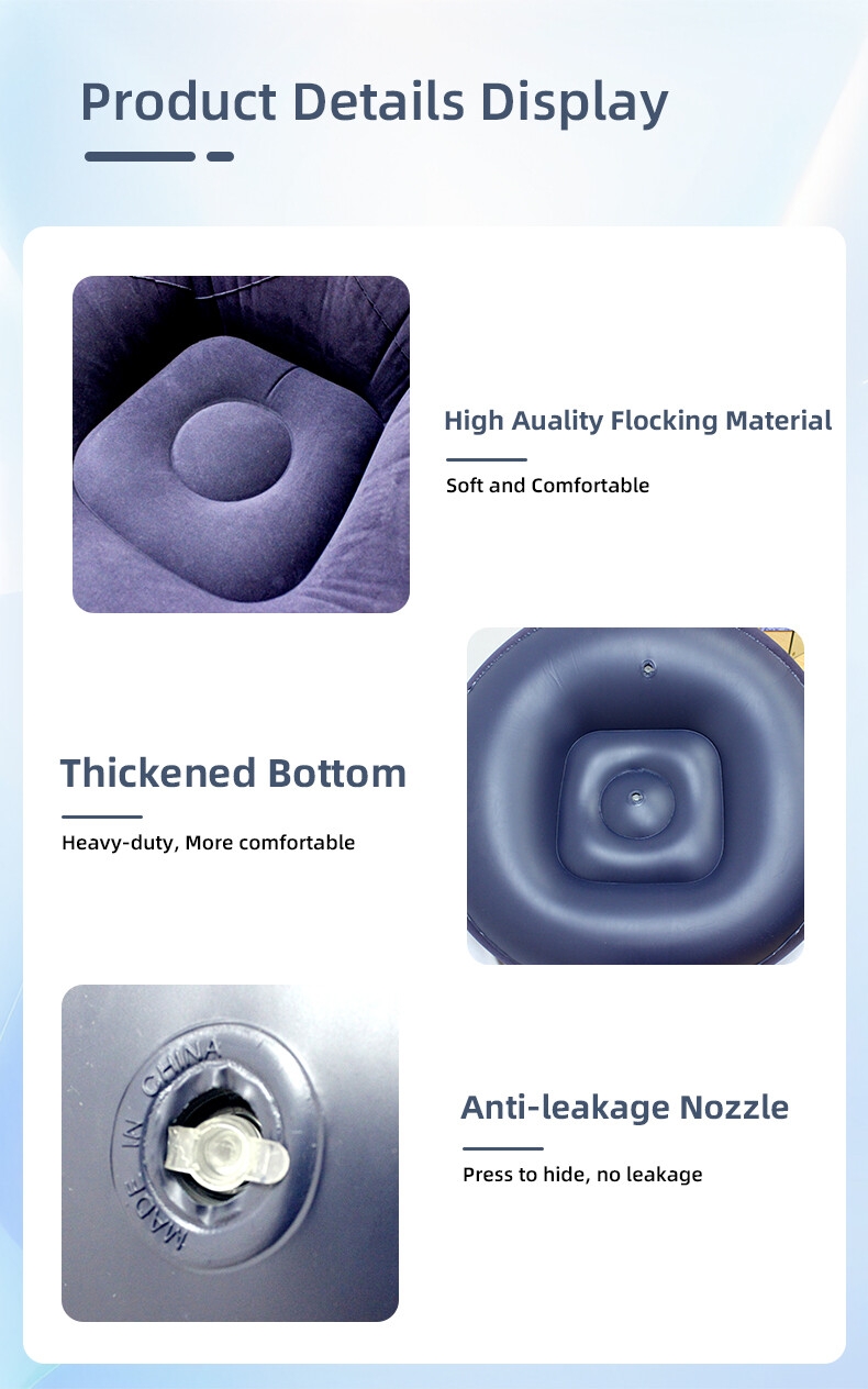 High-quality flocking and PVC material: Our inflatable recliner is made of high-quality flocking and PVC material, which is soft and comfortable while ensuring durability. Enjoy the luxurious feel and reliable quality of our premium materials.