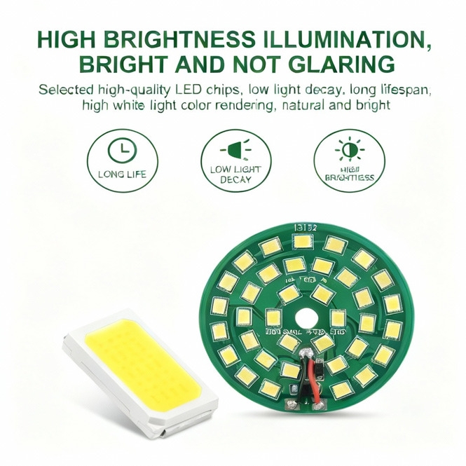 - 30 high-grade SMD5730 LEDs + high-transmittance PP shade: strong, even, non-glaring brightness