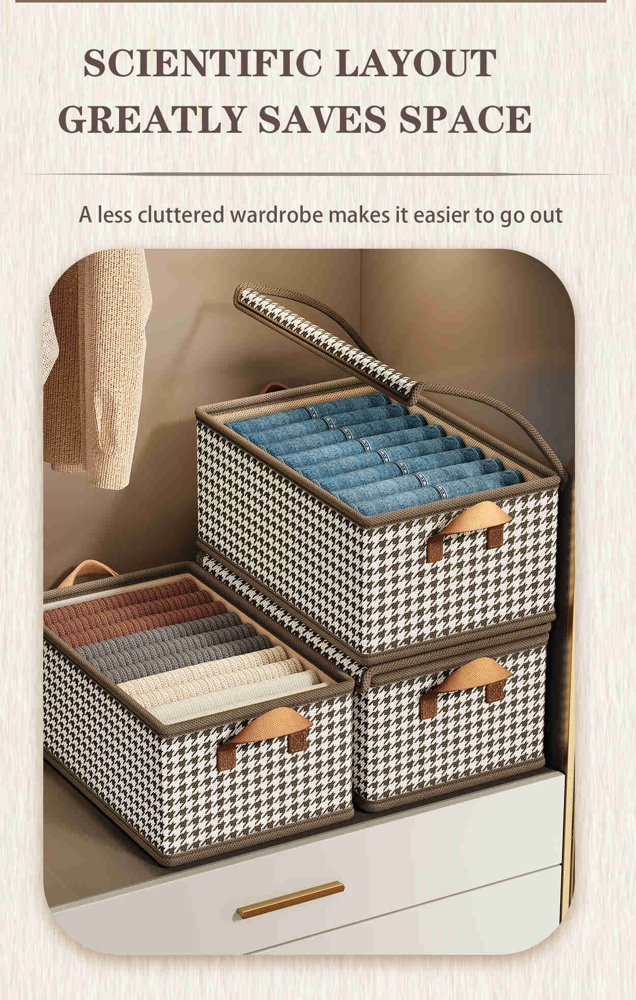 The bottom of the clothes and pants storage basket is density board, and the border is solid core galvanized steel frame. Foldable design, seamless storage, space saving