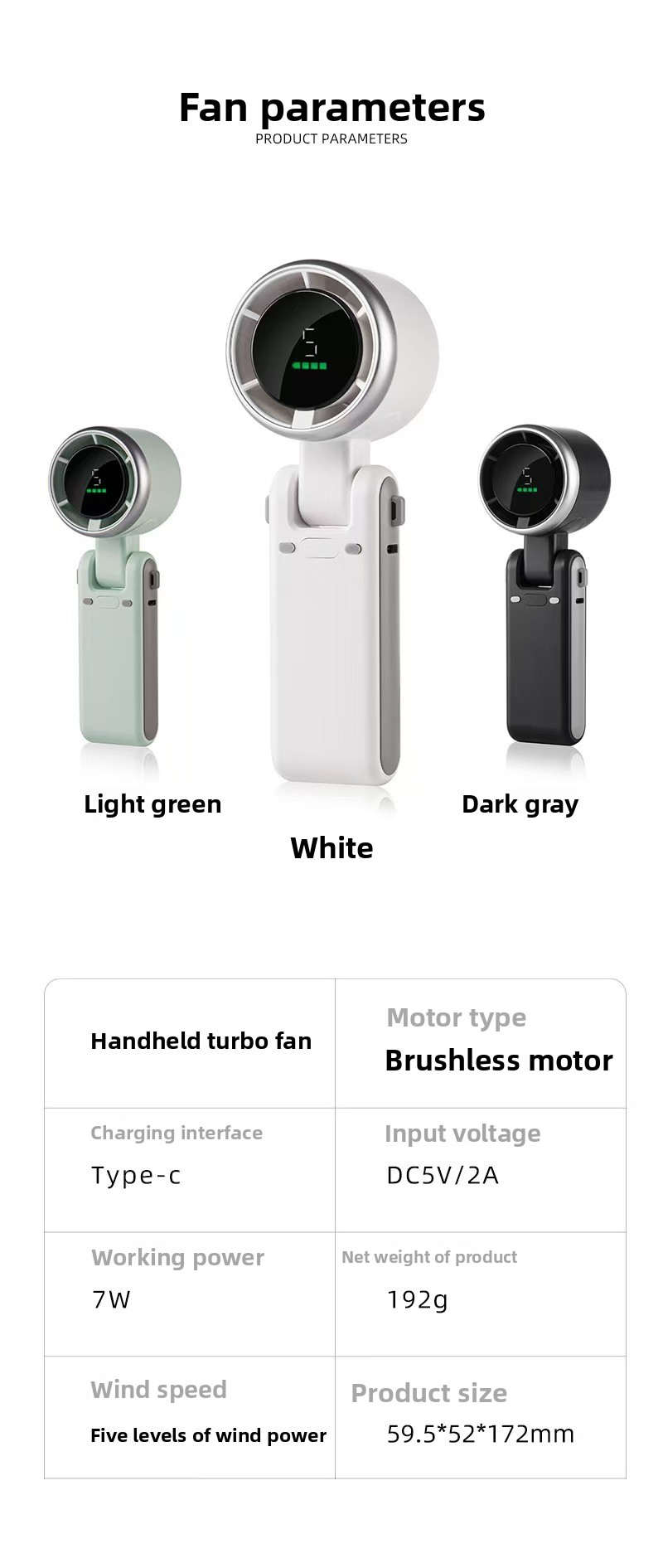 Key Features Additional feature: Foldable Item No.: 607 Color: Black Size: Foldable high-speed brushless motor [built-in 18650 battery] Motor Type: Brushless Motor Shell Process: Abs Noise: 36db (a)-45dB (a) (Inclusive) with a Built-in Battery Or Not: Built-in Battery Built-in Battery Capacity: 2000mah-4000mah (Included) Packing volume: 177*64*589 Product Net Weight: 192 Power Type: Lithium Battery Appearance size: 177*64*58 with Usb Or Not: Yes Number of Blades: 6 Or More Fan Speed Mode: 5 Th Gear Battery Life: 3-6h (Included) Fan Classification: Handheld Fan Operation Mode: Normal Button