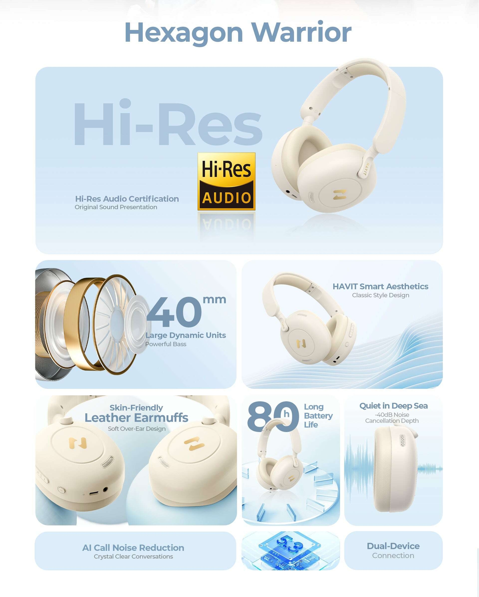 Headphone Dimension: 195*173*82mmHeadphone Net Weight: 253gUSB Port: Type-CHeadphones Battery: 700mAhCharging Time: 2.5hInput Voltage/Current: DC 5V/1APlay Time: 80h (60% vol., ANC off), 48h (60% vol., ANC on)Wireless Version: V5.3Wireless Working Range: 10m (without obstacles)Speaker Size: 40mmSpeaker Frequency: 20Hz~40kHz