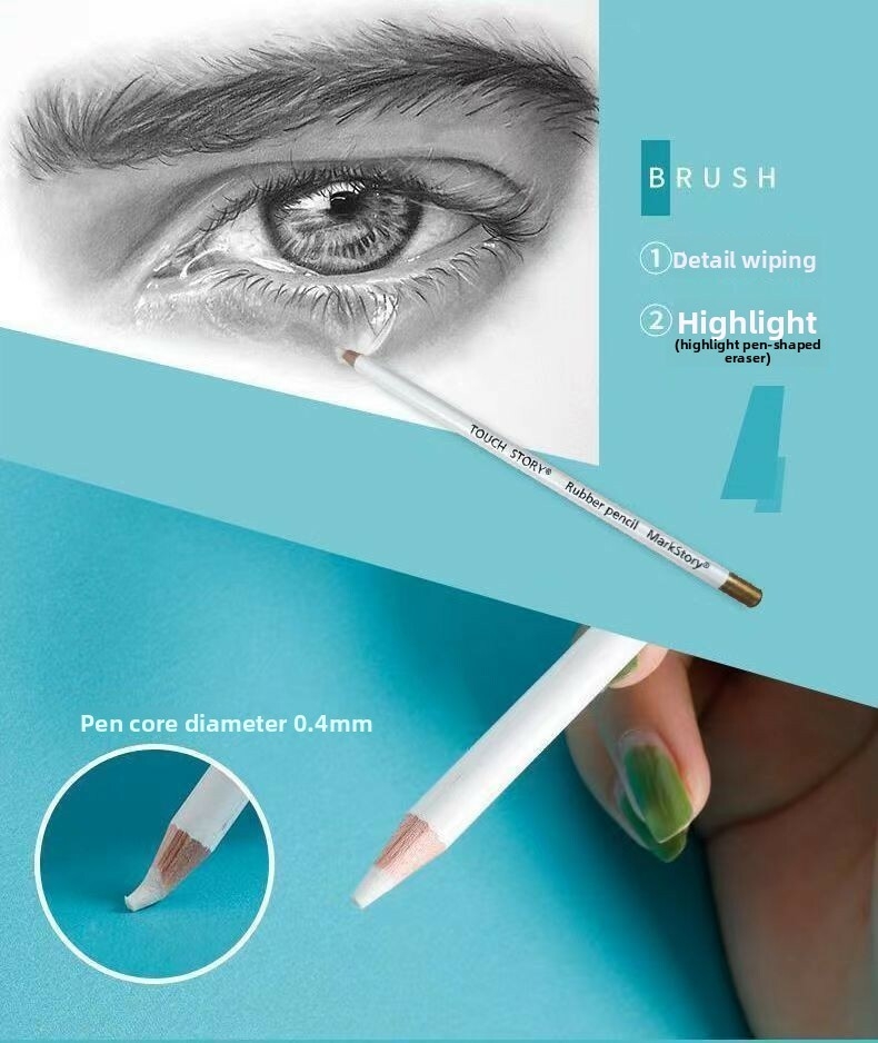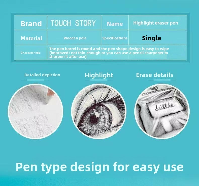 Key Features Item No.: Highlight Eraser Pen Model: 0101 Material: Wood Specifications: Highlight Eraser Pen Purpose: Eraser Pen Net weight: 12g Size: 17.5cm