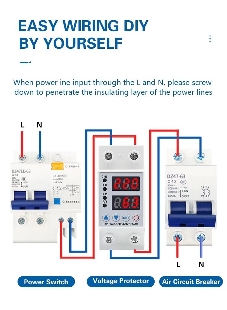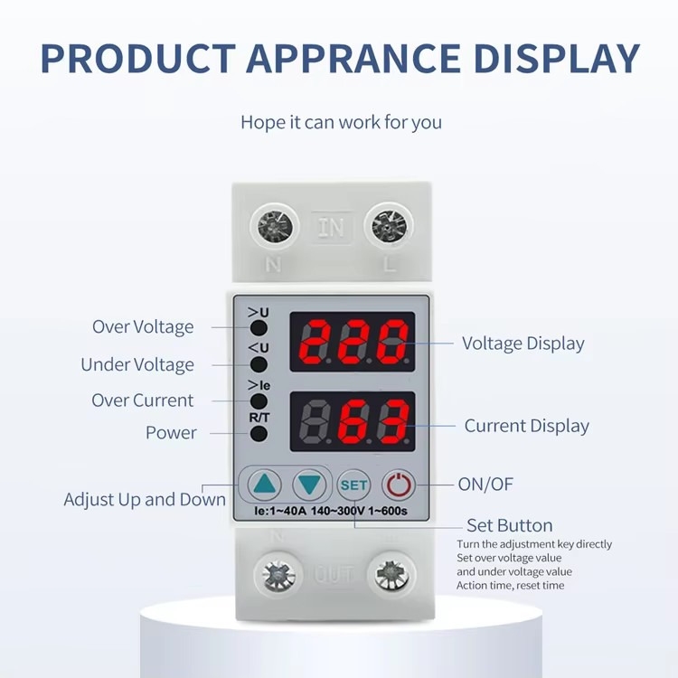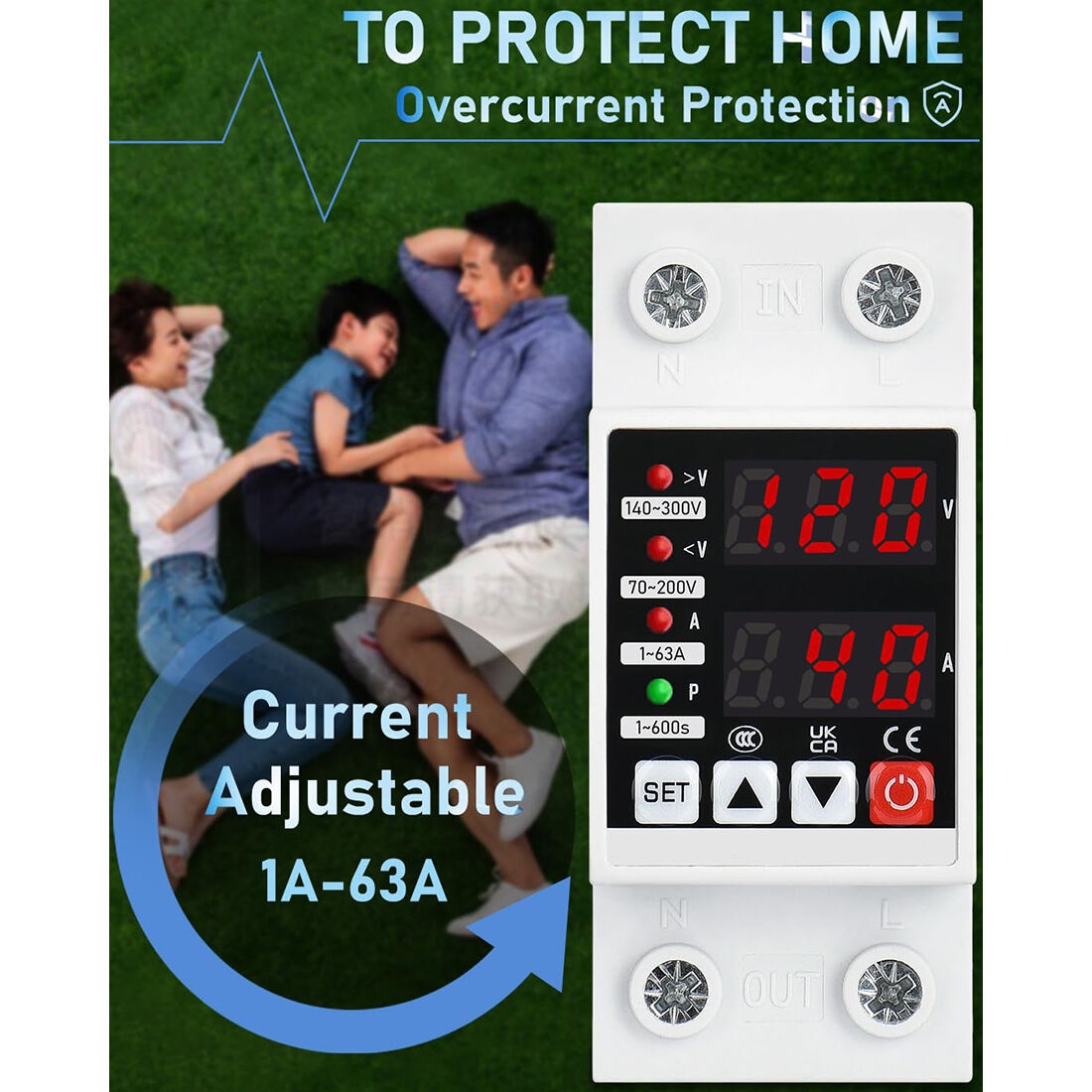 HomeElectronicsAccessories & SuppliesPower ProtectionSurge ProtectorsIntelligent self-reciprocating overvoltage protector 2P overvoltage undervoltage overcurrent lightning protection home appliance protector 220V 63A