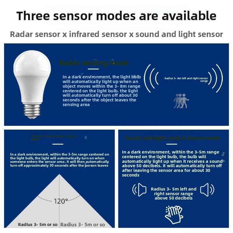 Key Features Origin: China Model: LED Sensor Light Input Voltage: 220 V Beam angle: 270° degrees Color rendering index: 60-70 Power factor: 0.6 Lamp body material: Plastic Lampshade Material: Plastic Is dimming possible: No Overall dimensions (Φ*H): 60*110mm Weight: 100g Protection level: Other Energy Efficiency Level: None Power: LED Radar Sound Control Sensor - 9W (A Bubble Model) Lamp holder specifications: E27 Applicable objects: Property/Aisle/Stairs/Garage