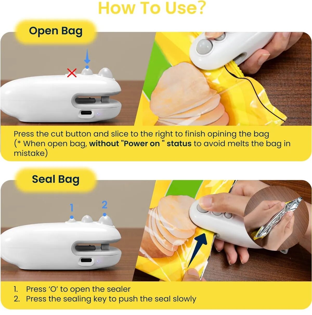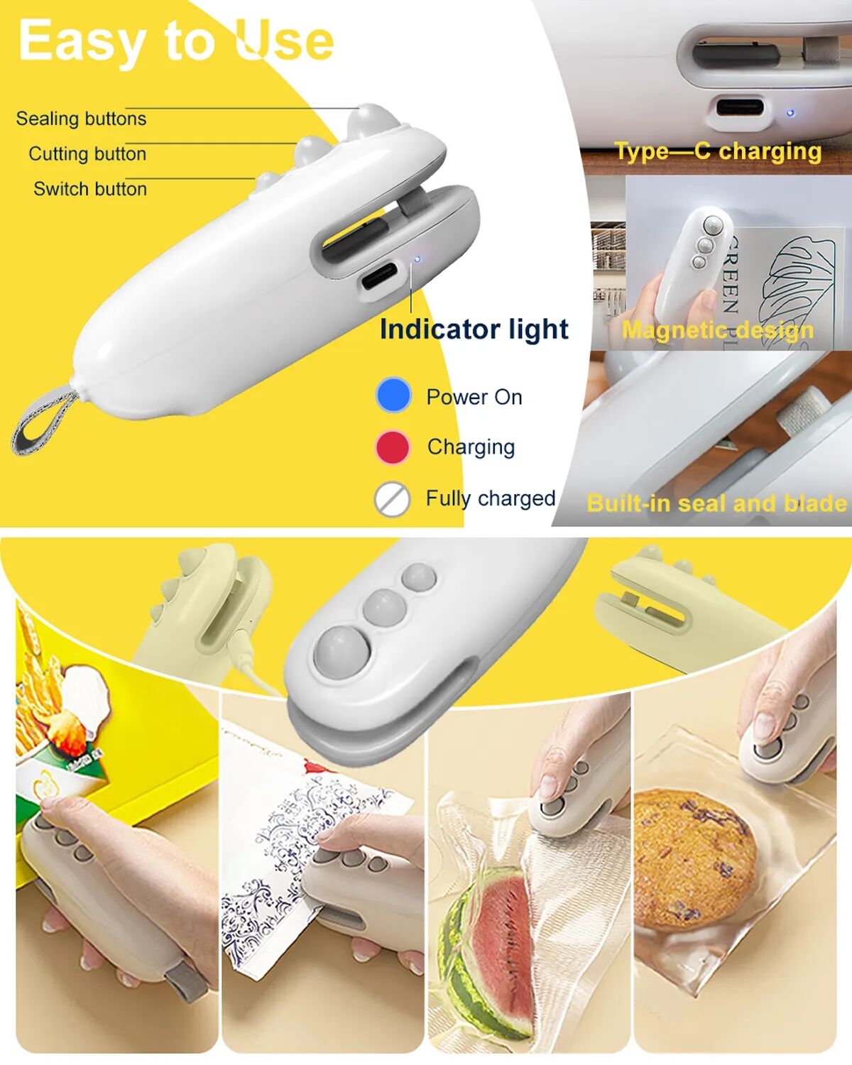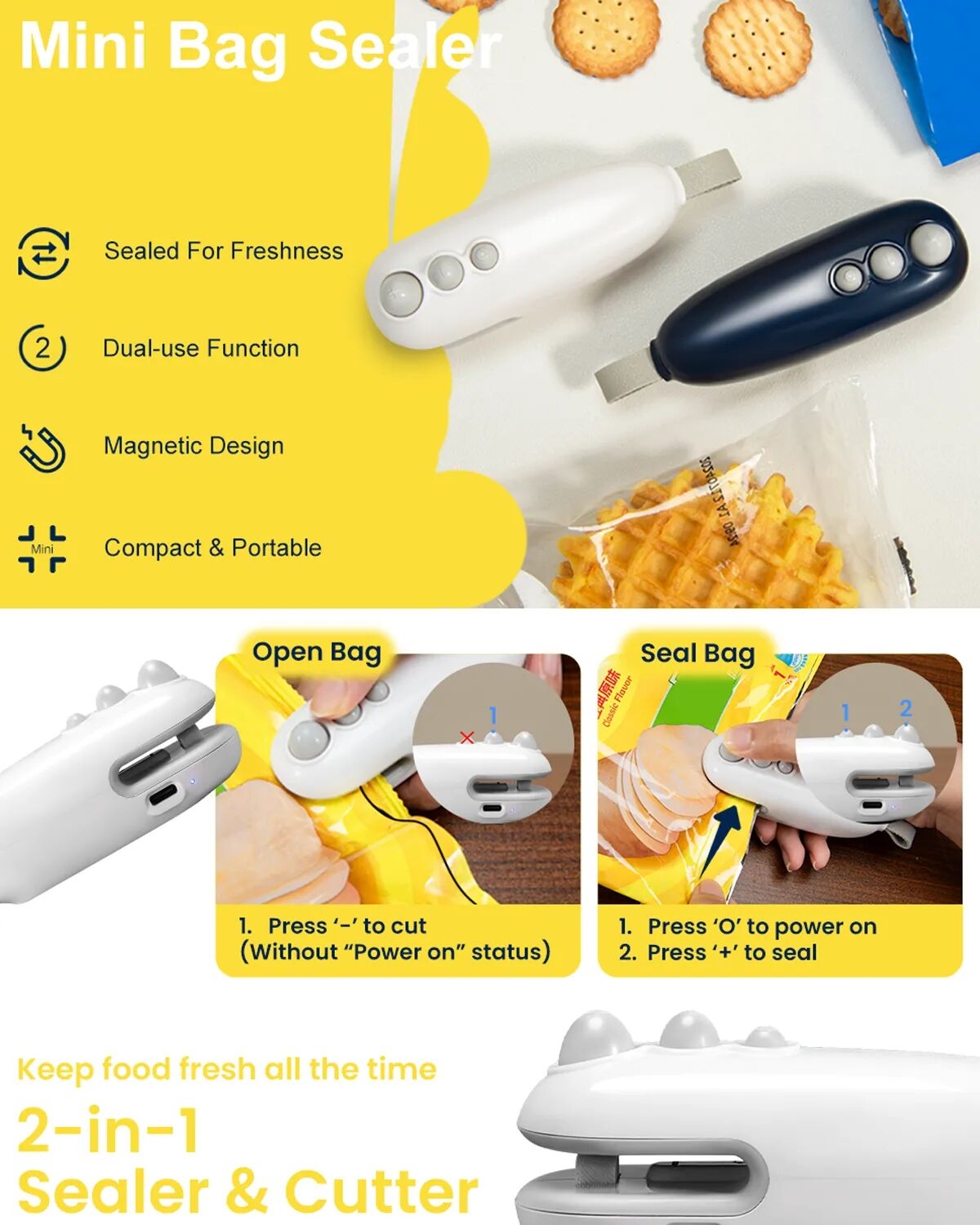 2 IN 1 Mini Bag Sealer with Cutter: This USB-C rechargeable mini bag sealer functions as both a heat sealer and a hidden cutter, allowing you to seal or open bags with ease! It's an excellent kitchen helper.