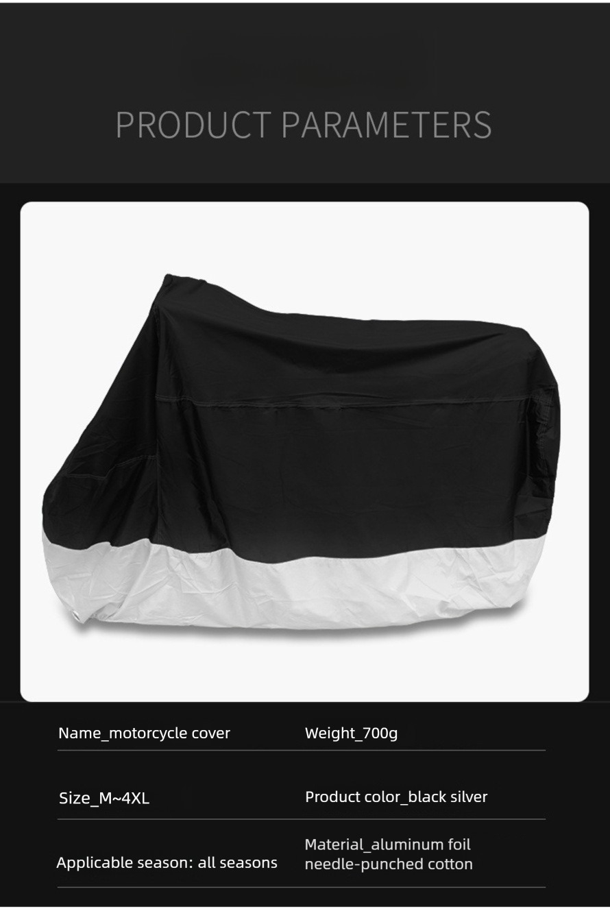 This motorcycle cover features a sleek black top and silver bottom design. Made of thickened material, it offers full protection against sun, rain, and dust. Available in 3 sizes to fit various bike models.
