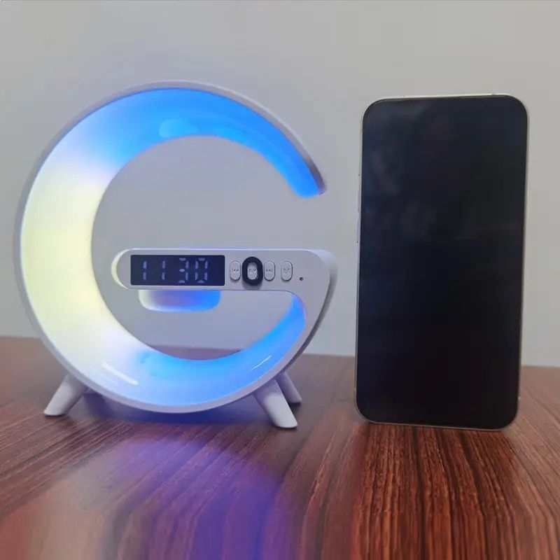 Multi-Function G Shape Bluetooth Speaker with Digital Alarm Clock, Wireless Charger, FM Radio, LED Night Light, and Dual Speakers