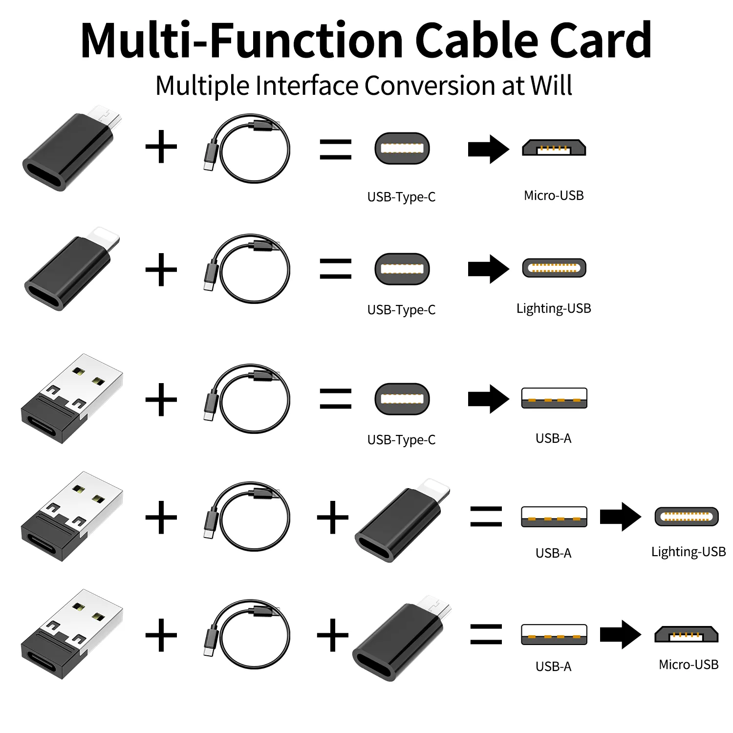 Multifunctional data cable set USB conversion storage box Describe: USB data cable conversion storage box, various charging cable converters, micro data transfer tool, including SIM card slot tray ejection pin. Compact and convenient, with multiple converter adapters included, you can easily slip this travel adapter USB C into your purse or handbag wherever your travels take you. When you have the opportunity to travel to other countries, you can change the SIM card to your phone. It has a place to safely store your SIM cards and an ejection tool to eject them. Features: 1. All-in-one charging: No need to fumble around for the right connector. This portable storage case contains everything you need to charge and sync your devices. Storage box protects cable ends and prevents cables from getting tangled in the bag. 2. Durable Material: All adapters are made of scratch-resistant aluminum alloy. The internal copper wires are larger and thicker than regular cables, helping to charge your phones, tablets, laptops and more faster and transfer data. 3. Safe charging and data transmission: The mini digital gadget has four different ports for conversion, charging, transmission, etc. Includes USB C cable with 3 USB adapters, everything you need to charge your devices and transfer data. 4. Phone and tablet holder: This USB to Lightning adapter can also be used as a phone or tablet holder, you can use it whenever you need a phone holder to hold your phone or tablet. 5. Multifunctional storage box: This 9-in-1 cable box comes with 3 storage slots, 2 for nano SIM cards, 1 for micro SIM card storage (SIM card not included) and a SIM eject tool, Helps you exchange and store your SIM cards. Compact and convenient, you can easily slip this travel adapter USB C into your purse or handbag no matter where your travels take you.It also comes with a makeup mirror so you can always check your status. Specification: Colour: Black Packing size: 8*7*1.25CM Weight: 0.05kg Package includes: Multifunctional data cable set*1