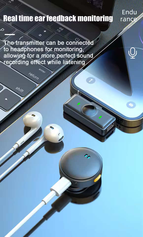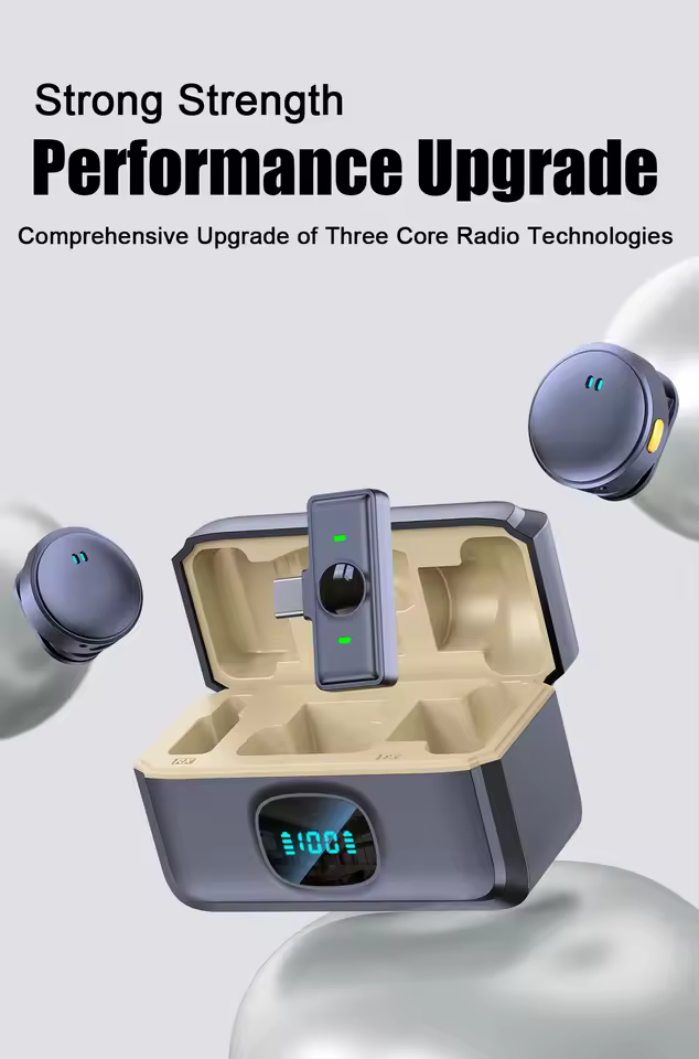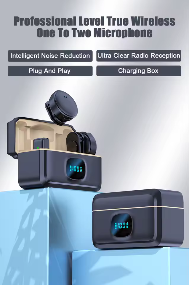 One To Two Microphone Professional Level True Wireless 1, Intelligent Noise Reduction 2, Ultra Clear Radio Reception 3, Plug And Play 4, Charging Box Strong Performance 1, Double noise reduction 2, Cloar sound quality 3, Power digital display 4, 1 second connection 5, 48h ultra long endurance 6, Powerful and compatible Strong Strength Performance Upgrade Comprehensive Upgrade of Three Core Radio Technologies Brilliant in every aspect Comprehensive Upgrade Support for mobile audio playback One click active noise reduction Plug and play 1, Magnetic suction button:Collar clip/Magnetic attraction/Multiple uses 2, 80dB signal-to-noise ratio:Rejecting current ncise, the sound quaity is not only beter 3, 2.4G Chip 4, Real time ear return 5, One click noise reduction 2.0:Low cut+ENC environment noise reduction Fearless of noise Upgrade dual noise reduction Upgrade low cut+ENC environment noise reduction,accurately reduce noise of different frequencies,and preserve the original texture of human voice Supports Strong Magnetic Attraction Back clip design Easy to install The back clip design, combined with magnetic suction accessories, makes installation very flexible. The transmitter and receiver are very easy to carry, allowing the transmitter base to be easily and quickly clamped onto clothes. Real time ear feedback monitoring The transmitter can be connected to headphones for monitoring,allowing for a more perfect sound recording effect while listening Breaking through 40 hours of battery life Paired with a charging magic box,the comprehensive endurance can reach 40 hours,and the single microphone can reach 10 hours 1, 1.5H Charging time 2, 10H Single endurance 3, 40H Composite endurance Recording without power outage The sound never stops The receiver is equipped with a direct charging interface for recording phone charging Two No Misses Live Streaming Continuously Electric Sound Recording Enough Addiction The receiver is equipped with a direct charging interface for recording phone charging Two No Misses Live Streaming Continuously Electric Sound Recording Enough Addiction No external sound card required Directly connected to a computer Connect the computer to a microphone for listening or live streaming, plug and play. One click noise reduction Quiet in an instant